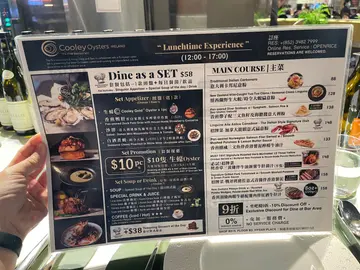 今日同朋友去咗铜锣湾希慎广场嘅 Cooley Oysters 叹个靓 lunch,顺便庆祝一下生活中微小但值得纪念嘅时刻。餐厅设计简约高雅,吧台位置可以近距离欣赏厨师即场烹调,气氛一流。作为主打,Cooley Oysters 当然要由生蚝开始。今次试咗两款不同熟成时间嘅 Cooley Gold:- Cooley Gold 45月:入口清新,海水味适中,咸香中带少许果香,肉质滑嫩,系初试者都会喜欢嘅味道。- Cooley Gold 60月:味道明显更浓郁,层次分明,带有坚果同奶油嘅尾韵,回甘悠长,系生蚝老饕必试之选。午餐加 $58 就可以选择前菜、汤或饮品,性价比相当高。- 椰菜花餐汤:质地幼滑,椰菜花味道浓郁但唔腻,配上少量黑松露油,提升整体香气,暖胃又开胃。- 香煎鹅肝:外层煎得微焦,内里软滑如奶油,鹅肝香气扑鼻,配上微甜酱汁,平衡油脂感,绝对系奢华之选。主菜:- 香煎顶级纽西兰肉眼牛扒配薯角伴红酒牛仔汁:选择 Medium Well,牛扒外焦内嫩,肉汁丰盈,薯角香脆不油腻,红酒牛仔汁浓郁醇厚,完美提升牛肉风味。- 香煎日本带子配三文鱼籽及海胆酱意粉:带子煎得金黄焦香,肉质厚实,三文鱼籽爆汁咸香,海胆酱滑而不腻,均匀地裹住意粉,每一啖都系海洋嘅精华。…查看更多