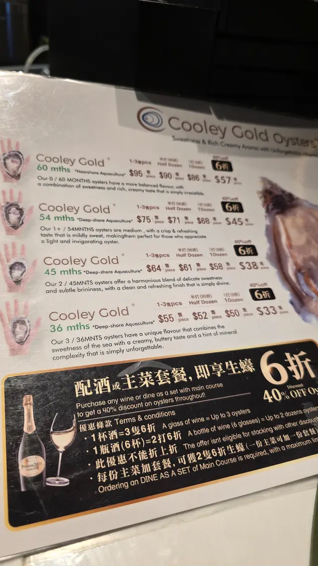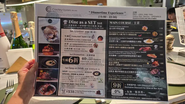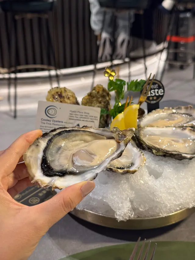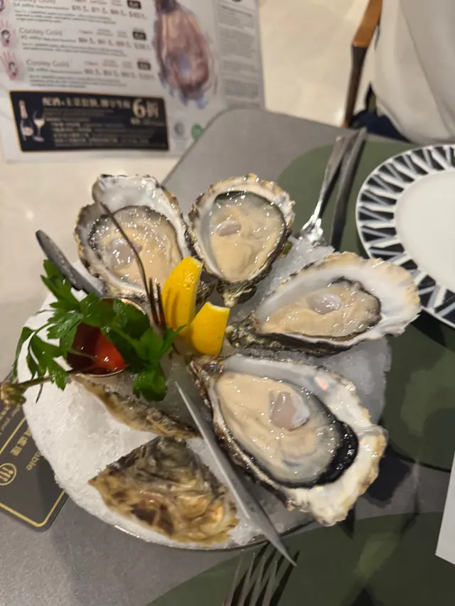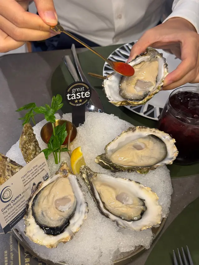 今日同朋友去咗銅鑼灣希慎廣場嘅 Cooley Oysters 嘆個靚 lunch,順便慶祝一下生活中微小但值得紀念嘅時刻。餐廳設計簡約高雅,吧檯位置可以近距離欣賞廚師即場烹調,氣氛一流。作為主打,Cooley Oysters 當然要由生蠔開始。今次試咗兩款不同熟成時間嘅 Cooley Gold:- Cooley Gold 45月:入口清新,海水味適中,鹹香中帶少許果香,肉質滑嫩,係初試者都會喜歡嘅味道。- Cooley Gold 60月:味道明顯更濃郁,層次分明,帶有堅果同奶油嘅尾韻,回甘悠長,係生蠔老饕必試之選。午餐加 $58 就可以選擇前菜、湯或飲品,性價比相當高。- 椰菜花餐湯:質地幼滑,椰菜花味道濃郁但唔膩,配上少量黑松露油,提升整體香氣,暖胃又開胃。- 香煎鵝肝:外層煎得微焦,內裡軟滑如奶油,鵝肝香氣撲鼻,配上微甜醬汁,平衡油脂感,絕對係奢華之選。主菜:- 香煎頂級紐西蘭肉眼牛扒配薯角伴紅酒牛仔汁:選擇 Medium Well,牛扒外焦內嫩,肉汁豐盈,薯角香脆不油膩,紅酒牛仔汁濃郁醇厚,完美提升牛肉風味。- 香煎日本帶子配三文魚籽及海膽醬意粉:帶子煎得金黃焦香,肉質厚實,三文魚籽爆汁鹹香,海膽醬滑而不膩,均勻地裹住意粉,每一啖都係海洋嘅精華。…查看更多