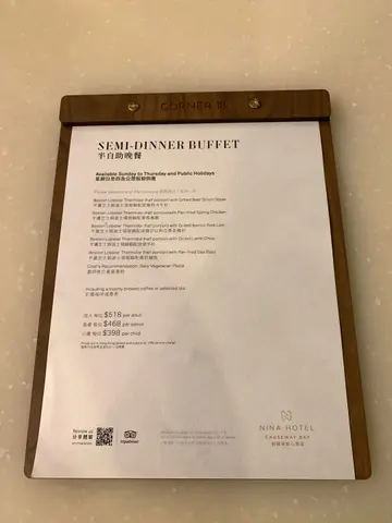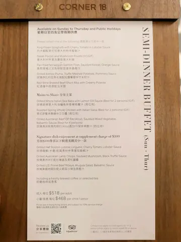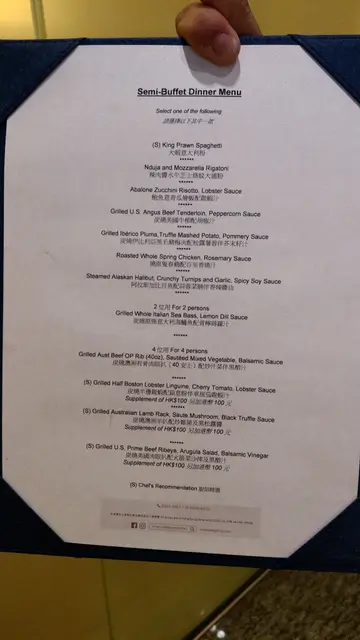 Semi dinner buffet $518/位 (星期日至四) +10%会员生日优惠免费 (要2人同行,另一位收取正价)Semi dinner buffet menu: 某些菜式 +$100 赠送:刺身、焗生蚝 & 香槟自取食物区:包括:冷盘、沙律、甜品...等!