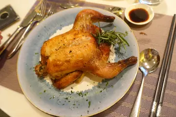 烧原只春鸡配百里香烧汁 所以,他跟我分享他的鸡肉,问我要什么部份?我就要肉质较粗嚡又不会太油腻的鸡胸肉,啖啖肉之余,香口又带有肉汁,肯定他食得津津有味嘞!