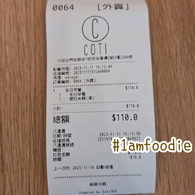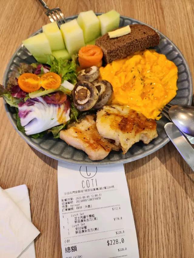 【沙田區】【Coti】我住沙田第一城,但我好少喺第一城食嘢。近年開通咗石門一帶,有好多嘢食,都吸引到我會時不時走過嚟呢邊食嘢。我本身嘅飲食習慣又唔多食大集團,呢一帶多小店嘅特色都令我有啲開心。然而,有啲又真係小食店嚟嘅。都想搵次用心啲逐間小店都同大家探討吓,不過絕對唔係呢日。行到嚟呢間 coffee shop 門口,見到佢哋都整到幾文青 feel,有啲木色襯吓其他淺色嘢,望落都舒服嘅。形式上都係先行去櫃枱落單,然後搵位坐、等嘢食咁嘅。我叫嘅係 $86 嘅「全日早餐」,都係叫 All Day Breakfast 比較穩陣,起碼有隻「炒滑蛋」,都唔會差得去邊。個「麵包」唔知係咪冇酸種包用牛角包代替之類,唔係聽得太清楚侍應講乜,但味道都可以嘅,所以都冇追究啲乜嘢。農作物有「沙律」同「茄汁豆」,都非我所喜,反而有埋「哈密瓜」幾驚喜,好少喺全日早餐見到。肉類就有「煙三文魚」同「雞扒」,正正常常。嘢飲我加 $24 飲「提拉米蘇咖啡」,算好飲。埋單價 $110,唔貴嘅都。。。(地址:沙田石門安群街1號京瑞廣場2期2樓228A號舖)#1amfoodie #foodie #hkfoodie #thatfoodiething #hkfood #food #instafood #yummy #foodlover #foodies #tasty #globaleats #tastyfood #foodpics #followforfollowback #love #eat #1am沙田區 #沙田 #石門 #Coti #全日早餐 #炒滑蛋 #麵包 #沙律 #茄汁豆 #哈密瓜 #煙三文魚 #雞扒 #提拉米蘇咖啡 #1am1230 #1ambackup查看更多