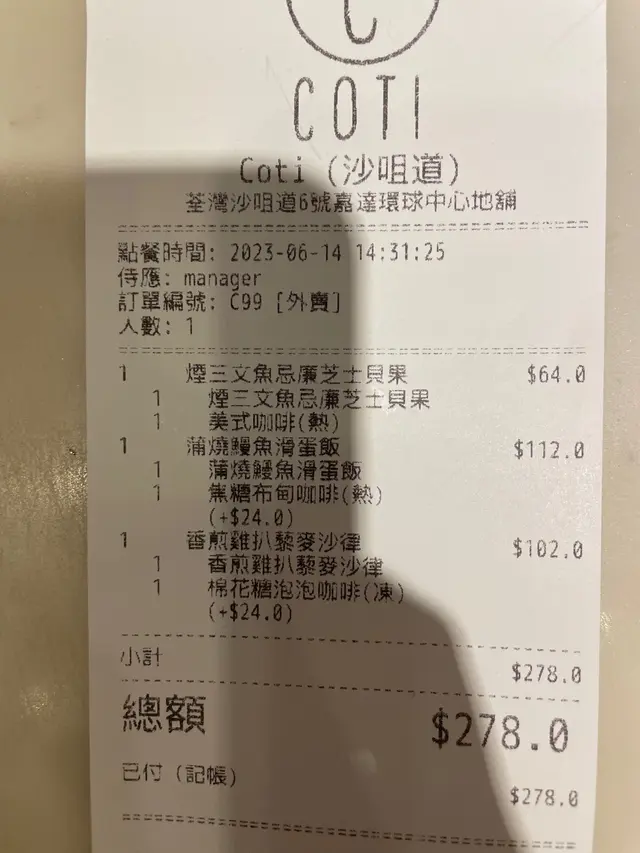 Coti (沙咀道) (荃湾) 网址: https://s.openrice.com/QrLS0QNe900 地址: 香港荃灣沙咀道6號嘉達環球中心地舖 电话: +852 25540618