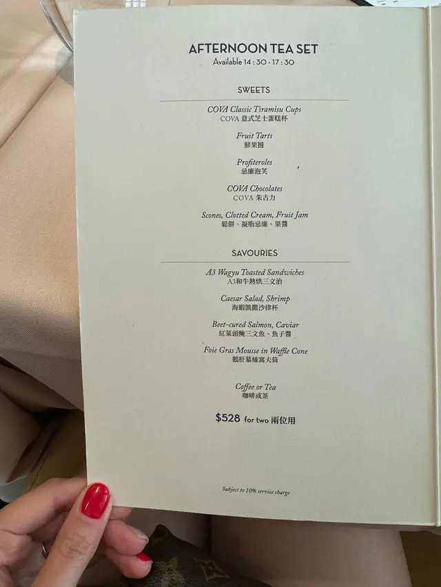 早近约朋友到Cova吃下午茶聊聊天餐厅设计古典优雅,高贵瑰丽彷似欧洲贵族在享受午后时光下午茶三层架和蓝色餐碟都是专程由意大利进口每件咸甜点都精致小巧,且加以名贵食材制作❥精致典雅下午茶 贵族之选 $538/2位❥ SWEETS✾ COVA 意式芝士蛋糕杯✾ 迷你鲜果挞✾ 迷你甜品挞✾ COVA 迷你扇子酥❥ SAVOURIES✾ 龙虾软包✾ 香煎带子脆饼✾ 和牛肉酱芝士挞✾ 水牛芝士伴樱桃番茄✾ 巴马火腿伴蜜瓜COVA 甜点一向出色,咸点亦很不错当中COVA 意式芝士蛋糕是最出名甜品之一意大利软芝士忌廉浓厚香醇蛋糕软绵而手指饼湿润带浓浓咖啡香表面洒满可可粉,层次丰富迷你甜品挞一口一个,可爱别致朱古力挞入口充斥浓醇朱古力香甜芒果忌廉挞富清新果香,轻盈软滑迷你扇子酥以100%顶级法国AOP牛油制作且本地人手制作,折叠成扇子造型入口酥脆松化,满满香醇牛油香味咸点方面以龙虾、带子、和牛肉酱等入馔龙虾软包以弹牙龙虾肉和青瓜蕃茄作内馅配搭松软面包,带清爽口感香煎带子脆饼口感丰富,带子煎至微微焦香入口鲜甜嫩弹配搭香脆脆饼和牛肉酱芝士挞满满牛肉香味,浓而不腻❥ 松饼、凝脂忌廉、果酱提子松饼与原味松饼由Cova自家制作外层金黄松脆,内层带点湿润富面粉香配搭酸甜草莓酱和浓郁奶香凝脂忌廉❥ Covaccino 一层忌廉和开心果碎碎在咖啡上香甜朱古力与香醇咖啡互相融合入口甘香顺滑❥ Earl Grey
