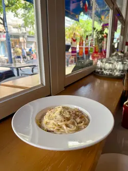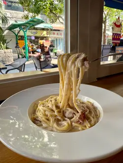 元朗呢间餐厅设有室内和室外座位,有时见到有带宠物的家长坐在室外,乐也融融。餐厅内可以透过玻璃望到街外环境。附近有个大型泊车表位,方便揸车人士。中午有set lunch,配有餐汤和饮品,很多中学生来吃。原来餐厅由外籍人仕主理,卡邦尼意粉令人惊艳,意粉与酱汁精华互相结合,意粉弹牙可口,加上熏肉增加嚼口,每一口都充满了浓郁的香气。味道丰盈又层次丰富。鸡肉沙律,首先份量十分足够,意像不到的满满一大盆,各款新鲜沙律鸡胸肉份量也不少,略略煎过外层金黄,味道层次更丰富。辣肉肠薄饼同样份量惊人辣肉肠薄饼,这道菜的饼底薄脆,馅料丰富。肉肠的香气与轻微的辛辣味相得益彰,让这道薄饼风味十足。特别是搭配的融化芝士,增添了浓郁的口感。不过,对于不太能吃辣的朋友来说,稍微的辣味可能会让他们感到不适,建议在点餐时提前告知厨师调整辣度。服务到位,定时斟水和换碟。加分。…查看更多