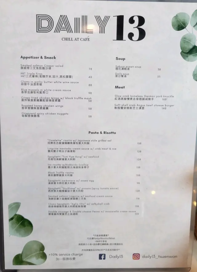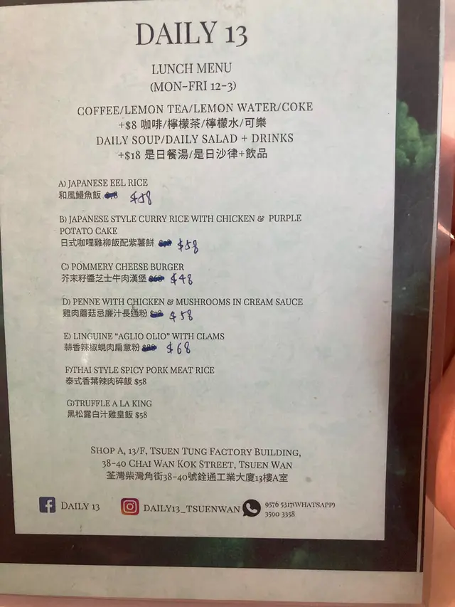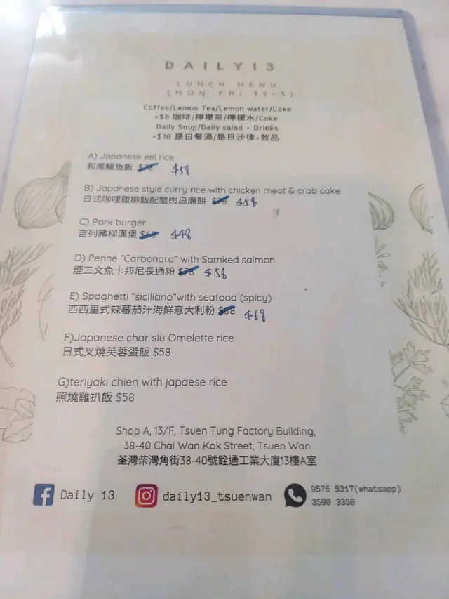 Daily 13 (荃湾) 网址: https://s.openrice.com/QrLS0FlS900 地址: 香港荃灣柴灣角街38-40號銓通工業大廈13樓A室 电话: +852 35903358