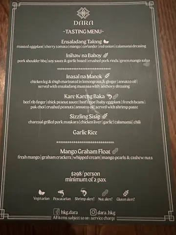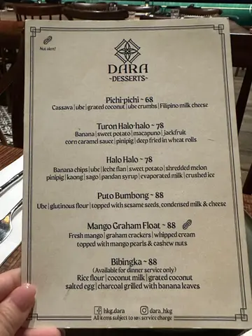 <西营盘高质菲律宾餐厅>🤩第一次食菲律宾菜式, 完全令我喜出望外相当有惊喜😍因为冇谂过系咁好味, 每一款菜既摆盘卖相都十分精致. 另外餐厅亦装修得非常有格调, 好啱一大班朋友黎chill & gathering 😎<Ensaladang Talong>😋 ~ 系茄子蓉沙律, 头盘相当开胃, 而且食落非常fresh.<Inihaw na Baboy>😋 ~ 烤猪肉串, 睇落以为好普通, 但其实呢道菜系我觉得最好味. 整个酱汁配合perfect, 而且肉质爽有口感.<Inasal na Manok>😋~ 鸡脾鸡肉嫩滑, 完全唔鞋. 易咬易入口. 十分惹味.<Galic Rice>😋 ~ 呢个饭绝对系出色, 加埋Galic好香, 完全系食完一啖后会想继续食好多啖!<Sillzing Sisig>😋~ 有猪面皮, 猪肉, 猪耳, 再用洋葱其他酱料一齐炒, 相当惹味出色.最后仲有个出色既芒果甜品, 食落感觉似雪糕 mix 蛋糕texture, 而且唔会太甜, yummy👍整体所有食物出色, 而且价钱唔贵, $299 per head, 食极都仲有quota, 一定会回头再食.🍄餐厅: Dara🍔地址: 西营盘皇后大道西189号西浦地下…查看更多