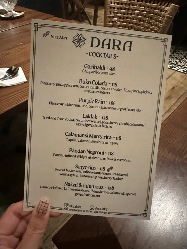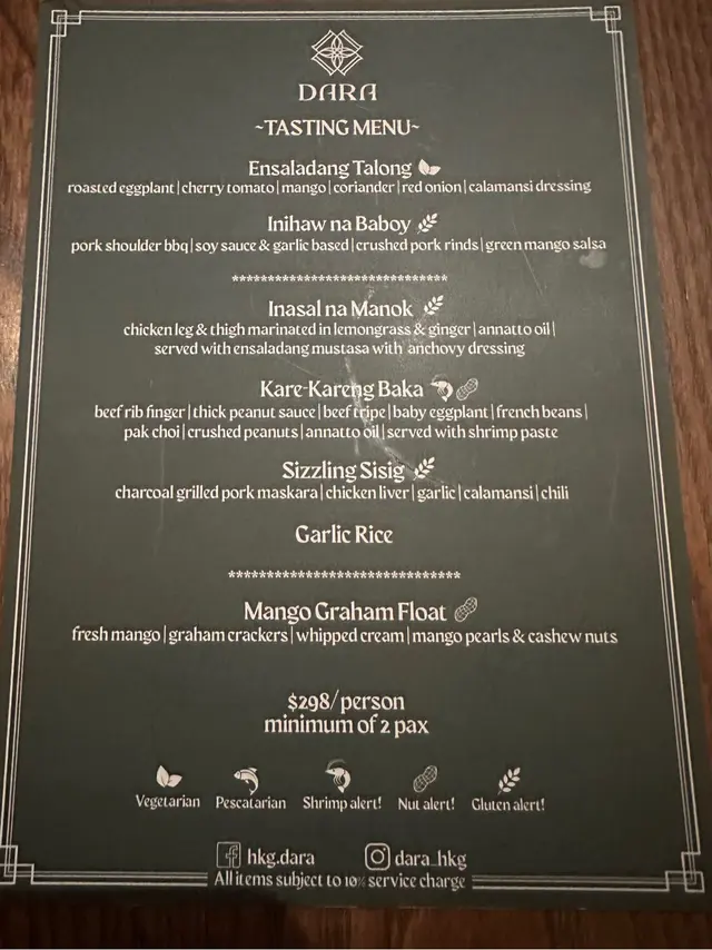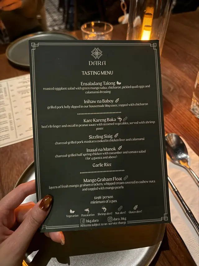 <西營盤高質菲律賓餐廳>🤩第一次食菲律賓菜式, 完全令我喜出望外相當有驚喜😍因為冇諗過係咁好味, 每一款菜既擺盤賣相都十分精緻. 另外餐廳亦裝修得非常有格調, 好啱一大班朋友黎chill & gathering 😎<Ensaladang Talong>😋 ~ 係茄子蓉沙律, 頭盤相當開胃, 而且食落非常fresh.<Inihaw na Baboy>😋 ~ 烤豬肉串, 睇落以為好普通, 但其實呢道菜係我覺得最好味. 整個醬汁配合perfect, 而且肉質爽有口感.<Inasal na Manok>😋~ 雞脾雞肉嫩滑, 完全唔鞋. 易咬易入口. 十分惹味.<Galic Rice>😋 ~ 呢個飯絕對係出色, 加埋Galic好香, 完全係食完一啖後會想繼續食好多啖!<Sillzing Sisig>😋~ 有豬面皮, 豬肉, 豬耳, 再用洋葱其他醬料一齊炒, 相當惹味出色.最後仲有個出色既芒果甜品, 食落感覺似雪糕 mix 蛋糕texture, 而且唔會太甜, yummy👍整體所有食物出色, 而且價錢唔貴, $299 per head, 食極都仲有quota, 一定會回頭再食.🍄餐廳: Dara🍔地址: 西營盤皇后大道西189號西浦地下…查看更多