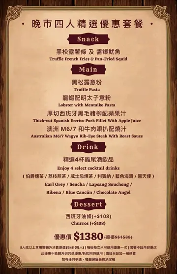 脆皮黑松露烧春鸡,炭烧黑毛猪,招牌烧汁配日本和牛扒,特浓海胆意粉,黑鳕鱼黑松露意粉,特式手功鸡尾酒