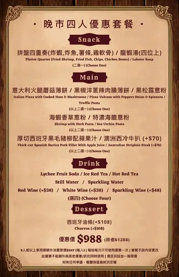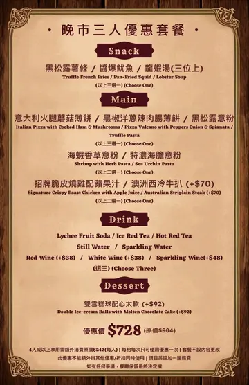 同朋友食饭叙旧,谂住揾间楼上餐厅舒舒服服食餐饭,就咁啱揾到呢间,见到个晚市二人优惠套餐,好似ok,就即刻叫咗黎试下。🟡 黑松露薯条呢个我每次见到都必叫,因为我好钟意食薯条😂😂薯条够晒新鲜热辣又大条,配埋个truffle mayo都好正。🟢 意大利火腿蘑菇薄饼因为好想食pizza所以就叫咗,Pizza饼皮外面松脆内里烟韧,芝士、火腿同蘑菇呢个配搭真系冇得输,而且食落口唔会太大负担,我同朋友都好钟意。🟣澳洲西冷牛扒食西餐既时候总系好想食牛,所以我地加左钱叫左呢个牛扒,真系煎得啱啱好,够晒juicy而且又好软淋,就咁食+点酱都好唔错!🟤荔枝梳打我同朋友咁岩都唔系几舒服冇饮到酒,拣左呢杯荔枝梳打,荔枝味几香,又够甜,饮落去真系几fresh,几好饮☺️…查看更多