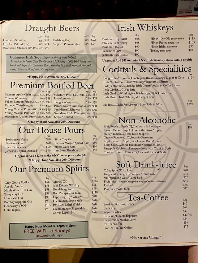 Delaney's Kowloon (尖沙咀) 网上订位即赚Rice Dollars 网址: https://s.openrice.com/QrLS0IG8000 地址: 香港尖沙咀北京道71-77號誠信大廈地庫 电话: +852 23013980