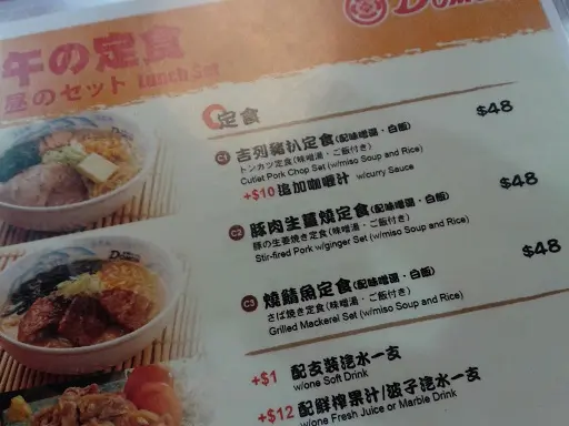 在愉景新城自成一角的Domon在午飯時間也不太滿座,位置小小的拉麵店也算坐得舒適,只是在拉麵店卻不吃其拉麵,只因午市定食有更想吃的炸豬飯哦。店方送來的熱茶竟像普洱?!在這家拉麵店也不理會是否正宗了,夠熱夠濃的熱茶反而對吃炸豬飯的我有利,熱茶能解油膩嘛。吉列豬扒飯定食($48)滿滿一盤的送來,如斯陣容在午餐而言也算豐盛,況且大吃一餐也可能令情緒跌宕的日子稍稍開懷一點。先來一口暖暖味噌湯潤澤一下,不期望有特別變化的味噌湯裡有還有幾片海帶及嫩滑豆腐粒,為本來單調的湯底加點變化。吃日本定食有也有泡菜,姑勿論是韓式還是日式,爽脆酸辣的大白菜泡菜也是不難吃的,胃口也霎時的被它的酸味打開了,它是有一定作用的耶。一整片的吉列炸豬沒有皮肉分離,全瘦豬扒肉質稍乾,厚度還可的豬扒最吸引還是那酥脆但熱氣的外層,脆卜卜的好難抗拒,只是隔油鐵網下還是出現一些油漬,拉麵店的炸功未及專門店也是情有可原。除了伴飯一流甜酸豬扒醬外這裡還有一朵日本沙拉醬花花,那看來像塑膠的甜甜沙拉醬用來混合不設添食的少量椰菜及半顆車厘茄,也勉強算是一份沙律,減輕一點吃炸豬的罪惡感;不知道可否加添的珍珠米白飯QQ的,一碗飯量在午餐已很足夠了,畢竟想再添吃也時間也不太允許。朋友的生薑豚肉燒跟吉列豬同價,以大量洋蔥及薑絲炒的豬肉片比炸豬更可伴飯,那甜甜醬汁帶點洋蔥甜香,連著少量脂肪的豬肉片也不會很油,怕熱氣的朋友最合她心意。整份定食連加一盛惠$53,在午餐而言不算便宜,況且水準也不算上佳,難怪在午餐時間也不滿座了,凡事總有原因的。…查看更多