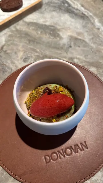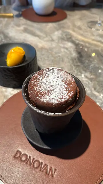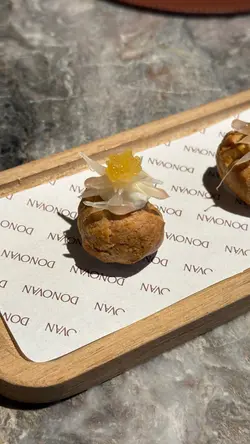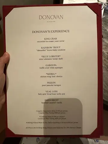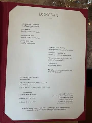 This restaurant is located on 16/F Cubus at Causeway Bay, a collaboration from two chefs Donovan Cooke and Scott Pickett. Previously known just as Donovan, the restaurant was closed for four months when Chef Donovan returned to Australia for a surgery and recovery. I was glad to see him return to HK and restart this business since April.Stepping out from the escalator one would see the wine cellars with a wide selection, and the staff leads us to the main dining room, able to accommodate around 30 guests. Seated at a booth, the whole ambience offers an intimate and cozy vibe, with warm lighting, comfy banquette, plenty of wood and brass in the furniture and decors.The Tasting Menu is $988 per person, and I also open a bottle of Marc Colin St-Aubin 1er Cru En Remilly 2021 ($1,280). The wine has nice citrus and green apple notes, with good acidity and a refreshing palate of minerality. A straightforward wine of finesse, it is best to serve slightly chilled but not too cold, to allow more aromas to blossom.The Amuse Bouche contains three bite-sized snacks. The first one is a Puff with Smoked Eel, with pomelo on top. The creamy filling inside the crunchy puff, together with the fragrant smoked eel, is enticing, with the pomelo giving a bit of sweetness.The second one is Shell stuffed with Diced Trout and Fennel, together with cream, dill and salmon roes. The perfect combination of trout and dill create wonders on taste, with the poppy salmon roe adding umami to this nicely done starter.The third is Chicken Liver Pate that is spherical in shape, coated with a glaze to resemble blackcurrant, and providing some acidity plus sweetness to balance the rich and indulgent liver pate. Served on a crispy chicken skin, it is a thoughtful presentation, not only pretty but also facilitates in picking up. More importantly, it is also delicious.The meal officially starts with Tsukuji Kanisho. The delicate Japanese king crab meat is mixed with Iberico ham, tomato and basil, before pouring in a tomato and vegetable consommé. On top is a tomato sorbet, sprinkled with some dehydrated black olives. A refreshing cold dish with lots of flavors, and nice appetizing acidity to start.The second course is Hokkaido Uni Chawanmushi. Under the silky-smooth egg custard are some Hokkaido sea urchin which are nice in taste, as well as pickled cucumber for a contrast in texture. On top, apart from the crunchy razor clam with nice umami taste, the chef has prepared a caviar and clam sauce with dill oil which are truly amazing in flavours.The bread served is one of the highlights on this meal. With a crunchy crust having a nice brown sugar caramelization, the brioche has a mild miso flavor embedded. Either on its own or paired with French butter infused with seaweed, it is very good.The third course features local Scallop seared beautifully while keeping the inside moist and soft. With some diced celeriac and apple to give a crunchy contrast, the sauce is made from the skirt of the scallop to provide umami flavors. Together with pepper and celeriac puree, and a bit of vanilla seeds, the black truffle shaves further adds to the rich taste.The fourth course is King Salmon, which has been slow cooked in olive oil, very tender and flavorful. On the side are some diced zucchini and tomato, plus the small but very sweet and delicious Bouchot mussels. The sauce is a blend of saffron and basil oil, and everything is harmonized in taste and super tasty. One of my favorites tonight.The fifth and additional course features Spanish Carabinero (supplement $180 each). Fully using every part of the prized red prawn, the prawn is half cooked to maintain its texture and sweetness, and a sauce made from espelette pepper and the prawn head with intense flavors, with grated yuzu to balance with acidity and refreshing palate. Very nice.The sixth course serves the prime Iberico Pluma, a special cut of pork known for its juicy and tenderness. Cooked perfectly, the pork is paired with a spiced sauce that brings forth a nice cumin fragrance but not the heat. Together with some butternut pumpkin, in the form of dice and puree, for a bit of sweetness. Very enjoyable.The seventh course features Bresse pigeon. The pigeon breast has been marinated with madeira, port and Armagnac, before slow cook and pan-searing to caramelize the skin. Fantastic in taste, with the meat tender and juicy, it is paired with a tasty sauce made with beetroot and blackcurrant. On the side is a beetroot tart, and finishes with a grilled pigeon leg, stuffed with pulled meat and tarragon. Another of my favorites on the menu.The eighth course is Pistachio and Cherry. Inside the bowl are cherry compotes of nice sweetness, with pistachio pieces to give a crunchy bite. On top is the cherry sorbet for its rich flavors, also providing the acidity to freshen the palate, along with pistachio cream at the bottom, helping to transition to the dessert and the final dish of the menu.The last course is a Valrhona Chocolate Coulant. The molten lava cake is perfectly baked, with the chocolate oozing out once the crust is broken. The rich 75% dark chocolate has the right balance of bitterness and sweetness, while the Mandarin Sorbet on the side provides an interesting contrast in temperature, and the acidity to balance.A Lemon Cream Madeleine is served as petits fours to wrap up the dinner. Service is very good, with the staff friendly and attentive, the sommelier is also knowledgeable on the wines. The bill is very reasonable at $4,281. With the good food quality, nice service and cozy ambience, it is a place I would like to return, to perhaps try the fours hand at the end of the month with Chef Donovan and Scott working together.…查看更多