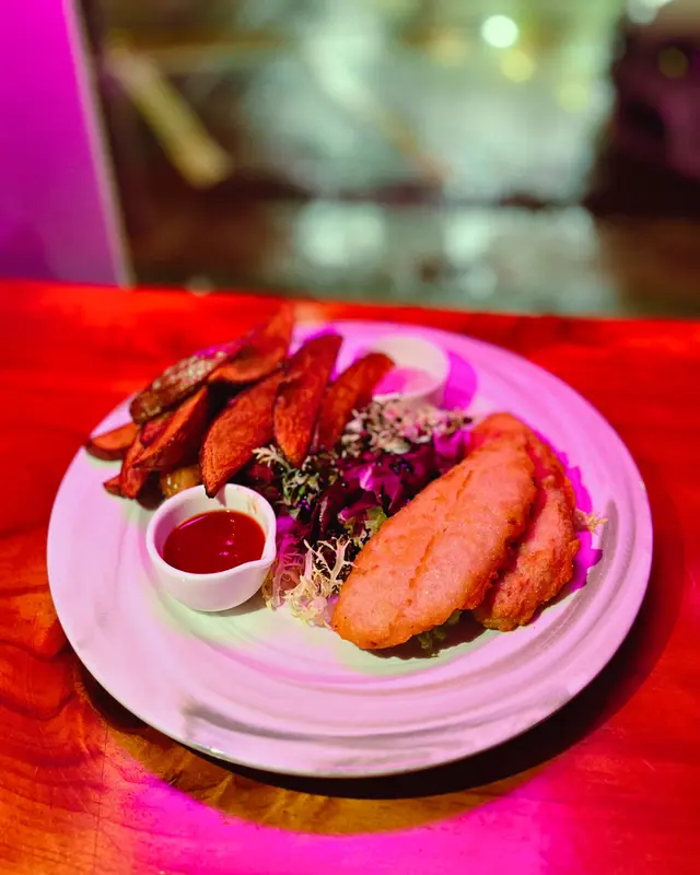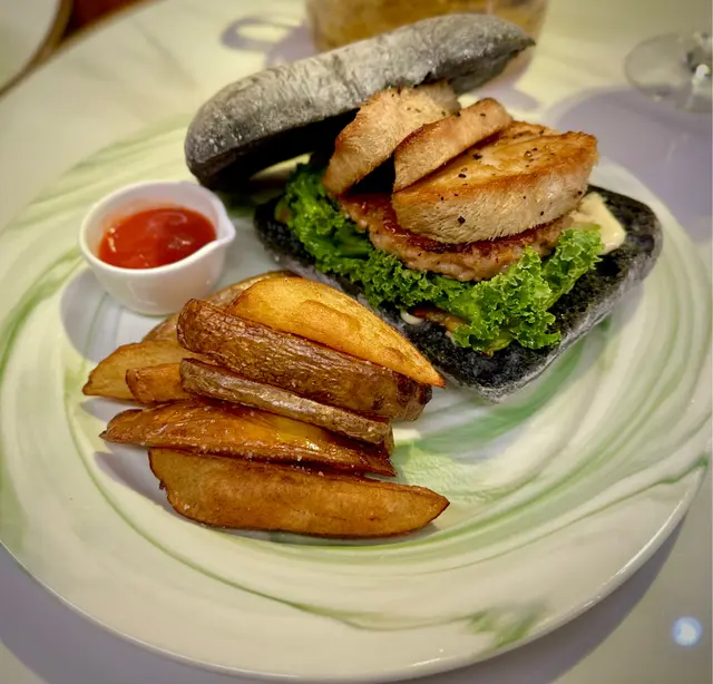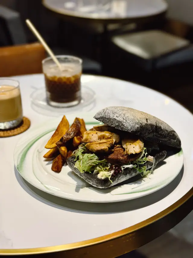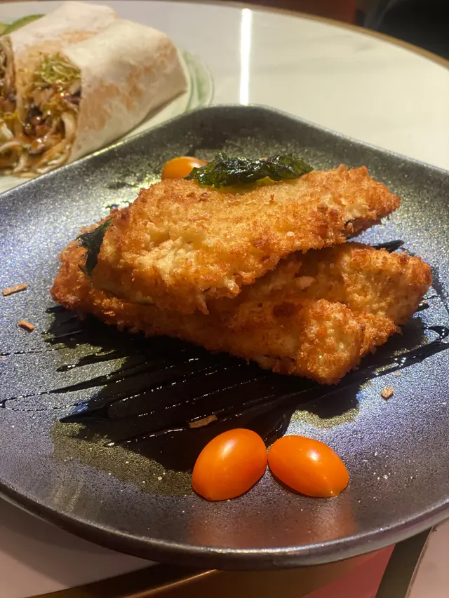 Liveband music 和純素料理的創意與風味🌱食物都有唔少選擇,意粉、漢堡🍔、小食等等。鐘意西式料理同素食嘅朋友可以一試~份量超巨型的猴頭菇拖鞋包, 黑色外型的拖鞋包外皮酥脆,內餡有猴頭菇🍄、新漢堡肉同埋生菜,配上輕盈的調味醬汁,口感幾豐富,旁邊仲有炸薯角🥔番茄意粉上的魷魚圈口感食落似魚蛋,幾彈牙,配上菇類同三色椒,酸甜的番茄醬汁帶少少香辣味幾過癮🍅純素魚兒他他薩拉色彩繽紛,帶有清新的感覺。牛油果醬上有模仿三文魚的粒粒,口感似jelly。加上清脆的小番茄,好refreshing 。純素食新炸魚柳外酥內嫩,魚柳口感都有點似真魚柳~搭配金黃的厚切薯條,非常飽足。另外飲品就有咖啡、果汁🍹等猴頭菇拖鞋包 $130火辣純素魷魚圈番茄意粉 $88純素魚兒他他薩拉 $88純素食新炸魚柳配薯條 $68Latte $40 Espresso Tonic $45查看更多