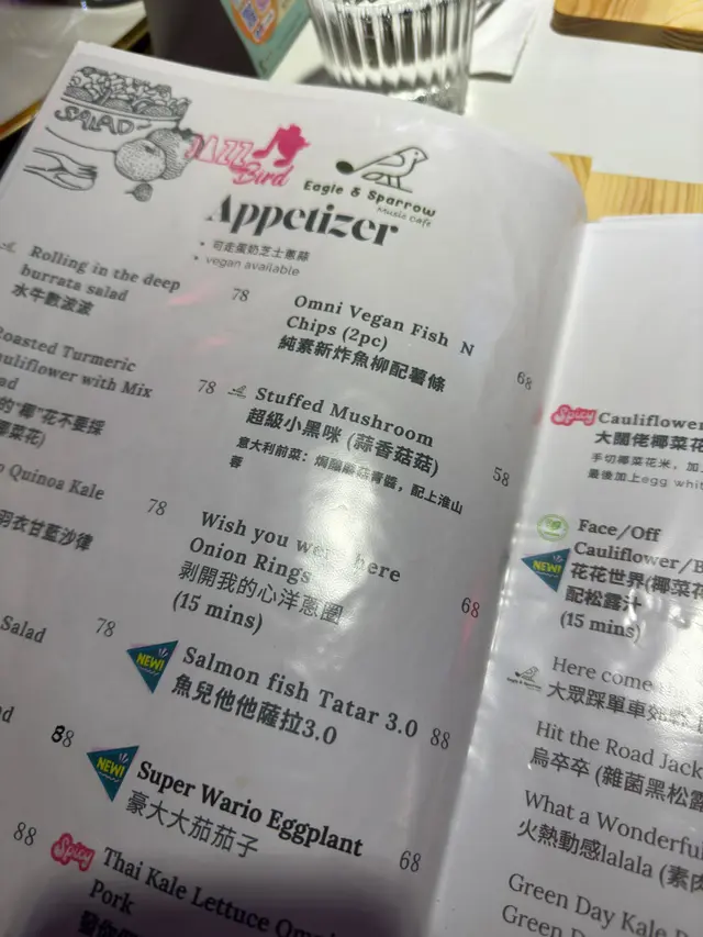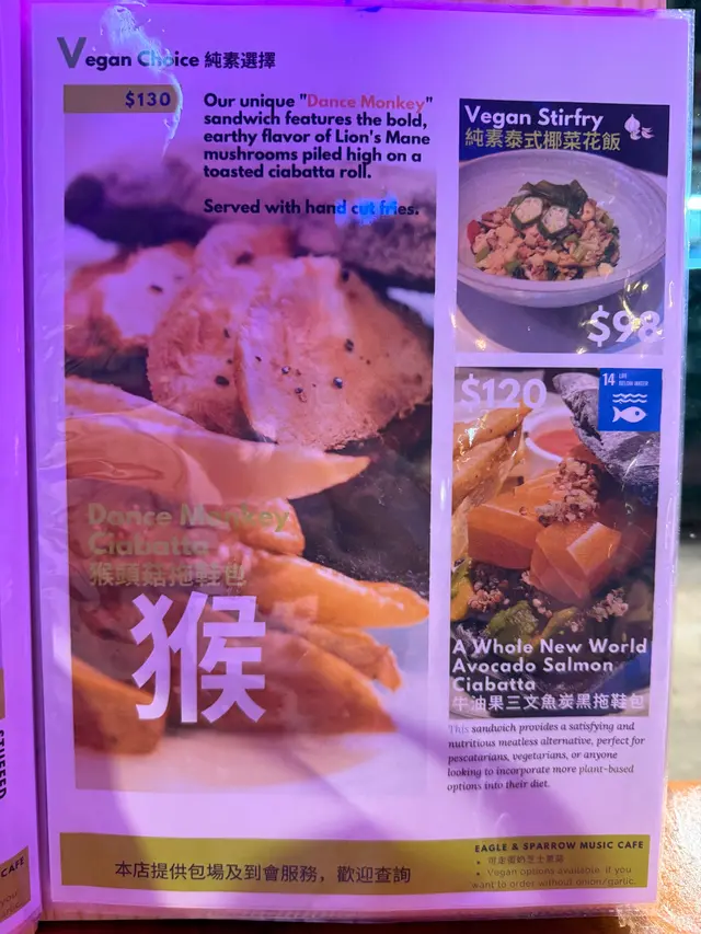 餐廳名字十分特別,叫「我行我素」,是一間社企音樂餐廳🎤🎹,提倡生酮及素食的健康飲食文化,而且每道菜式的名字都十分特別,很有心思餐廳星期四至日都有現場音樂表演,提供機會予本地音樂人,可算是佐敦的hidden gem,當天周日都全場爆滿 (溫馨提示:位置較少,建議先預約)純素新炸魚柳配薯條 $68新魚柳炸到金黃酥脆,口感和味道都接近真魚柳,口感較紮實,配上自家黑松露醬,推薦~薯條是原個薯仔切開炸的粗薯條,味道香口發你個財泰式生菜包 $78參照了泰式生菜包🇹🇭用了充滿豬肉口感的新豬肉,加入洋葱、檸檬葉、薄荷葉爆香一齊炒,再配羽衣甘藍醬及泰式香料,香氣突出又惹味,夾生菜食用,飽肚又健康大眾踩單車郊野上(鮮牛油果溫泉蛋忌廉意粉) $78意粉份量很多,麵質爽彈,creamy而不膩,搭配半流心的蛋黃拌勻吃用,蛋香濃郁,帶點牛油果的淡香味,整體味道偏清淡Crossroad轉角遇到愛 $78即是熱情果蝶豆花檸檬汁,以熱情果和檸檬為基底,倒入蝶豆花後可轉變顏色,味道酸甜,口感清新,打卡一流紅唇烈焰$68健康的甜品,以牛油果代替雪糕,與酸甜的雜莓打成奶昔,既清爽又滿足婆你呀摩$78以Tequila和青檸汁調製的雞尾酒,酒味較淡,酸甜平衡,清新爽口Draft Beer Asahi $58坐著聽音樂,配上啤酒剛好-總體評分-環境:7/10 食物:7.5/10 服務:8.5/10 抵食:8.5/10Eagle & Sparrow Music Café📍佐敦文蔚街23號地舖查看更多