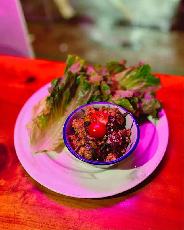 呢間小店係一間Fusion素食嘅音樂Cafe,提倡健康生酮飲食,位於佐敦同柯士甸交界,附近都有好多唔同類型嘅餐廳。佢屬於社企營運,俾機會唔同背景嘅人就業培訓,而且佢定期仲會派飯俾社區有需要嘅人,值得支持!周不時佢地都仲會有現場音樂表演,裝修同氣氛都唔錯🎶適逢Halloween period,餐廳有Halloween set dinner 🎃 值得一讚嘅係佢啲素食你都會覺得有食緊肉嘅感覺!荔枝藍莓合桃車厘茄沙律,簡單嘅一個組合幾清新,荔枝同藍莓整成兩者血眼creative,加左合桃令到口感更好紫粟米脆片配紅卜卜沾醬,粟米脆片本身冇咩味,但個沾醬好濃,仲夾住啲素肉粒,咁樣食都幾有口感同惹味南瓜濃湯不過不失,都Creamy主菜就有炸肉條杏仁片紅菜頭茄蓉意粉,同漢堡配手工薯條,用咗紅色同黑色為主襯返萬聖節。佢嘅炸肉條真係整得幾似真肉,撈埋蕃茄醬酸酸地,至於漢堡用黑色包皮,有煎素肉、炸素肉仲有炸脆片同炸豆,裏面夾住啲炸物令到個口感幾好甜品係爆炸糖忌廉咖啡朱古力Brownie,旁邊放咗杯咖啡比你倒上去個甜品度,倒上去嘅時候啲爆炸糖會發出吱吱嘅聲響,食落都幾得意,咖啡嘅苦澀味混合咗爆炸糖同朱古力Brownie嘅甜味,呢個配搭都幾襯。至於特飲係有人喜歡籃,係果汁梳打都幾refreshing整體嚟講都係一間有心嘅小店,而且仲有音樂表演同派飯回饋社會,值得支持吓查看更多