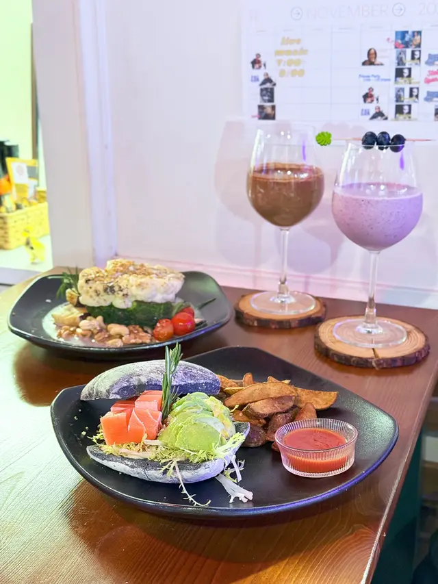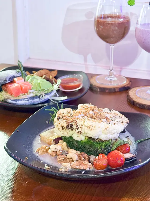 主要提供fusion 素食➕生酮菜單, 佢哋亦證明咗素食同生酮菜式都可以好好食㗎😋!佢哋仲係一間社企餐廳🍴, 推動多元共融理念, 為唔同背景嘅人士提供就業機會同專業培訓, 真係好欣賞佢哋嘅營運理念, 真心值得支持同respect🫡 逢星期四至日晚 7pm-9pm, 現場會有音樂表演🎤, 讓音樂人增加舞台經驗, 成個氣氛好chill!𓌈⸝⸝ 牛油果三文魚炭黑拖鞋包拖鞋包好鬆軟, 素三文魚刺身由蒟蒻製成, 質地Q彈滑順, 牛油果好軟滑🥑, 成個組合好夾!旁邊嘅薯角係用新鮮薯仔製成🥔𓌈⸝⸝ 花花宇宙西蘭花🥦、椰菜花扒又厚又大件!椰菜花表面呈金黃色, 帶有微微焦香, 底下配上松露汁, 個松露味恰到好處, 唔會話好heavy!旁邊啲伴菜蘸松露汁都好好味😋!𓌈⸝⸝ 三文魚他他由牛油果🥑、素三文魚刺身組成, 上面嘅沙律菜夠新鮮𓌈⸝⸝ 自家製生酮純素黑芝麻撻純素(無蛋奶)🌱、無麩質成份、無精製糖, 適合生酮飲食人士!撻皮鬆脆, 裏面係黑芝麻餡, 有啲似黑芝麻湯圓咁有沙沙嘅口感, 黑芝麻味好濃郁🖤🧉Mixed Berries Avocado Shake、Choco Avocado Shake兩款主要以牛油果同奶打成, 再加入雜莓/朱古力粉, 以羅漢果糖帶出甜味, 口感好creamy~ Vegan嘅朋友可以轉為燕麥奶㗎!查看更多