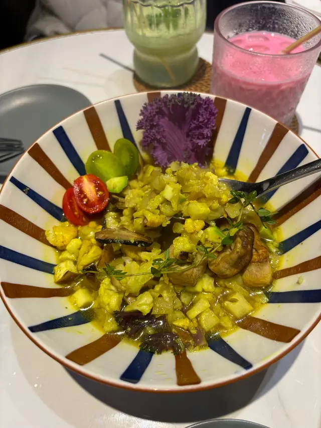 嚟到呢間唔講都唔知佢係食素嘅餐廳🥦同時佢哋都係一間社企餐廳,店舖雖小,但都應有盡有👍🏼佢亦都係一間Music Cafe,可以話係邊聽住好歌邊用餐,雙重享受🥰؄🪐 大闊佬椰菜花飯飯如其名,相當闊佬🤣皆因佢嘅份量同配料都非常之多😆椰菜花一定唔少得喇,仲有雜菌、羽衣甘藍等等嘅配菜🥬除咗好有口感之外,味道都唔會單調,食到有辛辣嘅味道,後勁都唔惹小㗎🫢但亦因為咁而變得惹味😋§🪐 生酮純素朱古力撻係好飽㗎,但係好想食甜品🫣於是就揀咗個會令你更飽嘅朱古力撻😆因為用咗生酮嘅手法去製作,同我哋平時所食到嘅牛油皮好唔同,咬口會多啲😌朱古力亦都唔會好甜🍫呢個唔怕肥,所以可以盡情大啖食😋§🪐 路邊的(椰)花不要採當你以為佢好寡嘅時候,反而俾到我最大嘅印象👍🏼將切開咗嘅椰菜花拎去炸,成品會有少少似雞球😌嗰種外脆內軟係好特別,味道雖然清淡但一啲都唔乏味,唔知道廚師用咗啲咩方法令到佢好似變咗身咁😋§🪐 純素千層麵千層麵係飽肚之選🤰🏻好喜歡佢嘅層次感,中間每一層都夾住唔同嘅蔬菜🥒麵層似係由熱香餅組成,再加埋芝士🧀一樣可以好邪惡🤤值得一讚嘅係無因為蔬菜嘅水份而令到整個千層麵塌咗,所以呢個位係控制得好好👍🏼؄一方面可以行善,另一方面就推行健康素食💪🏼創辦人開心,客人同樣都捧住個肚走🤰🏻؄🧸🌞 𝗖.𝗼𝗼𝗸𝗶𝗻𝗴𝗯𝗲𝗮𝗿推介指數 👉🏼👉🏼8️⃣🌟查看更多