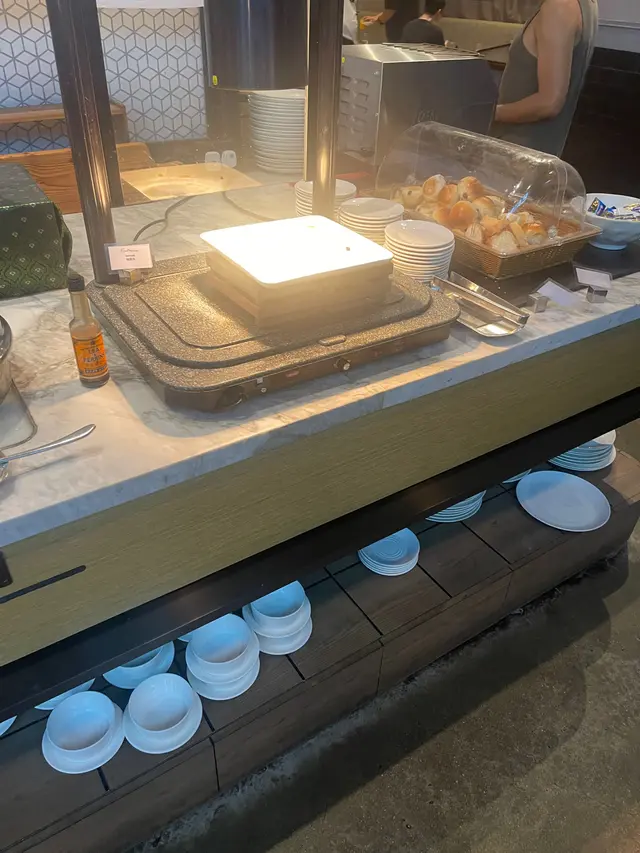 用餐日期:2024/01/08可用餐時段:11:30-14:30,3小時用餐費用(每人):$153餐廳環境:環境整潔乾淨 冷氣足 檯與檯之間闊落 坐得舒服 服務:服務員服務態度一般 自助區:自助區有沙律吧 面包+牛油 芝士 湯品 甜品 水果 雪糕 飲品 1: 沙律吧-這家沙律吧有5款沙律菜 8款配菜 5款醬汁 款式選擇不錯但沙律菜不新鮮味道一般 不推薦2: 熱食-自助區有2款湯(中湯+野菌忌廉湯) 4款麵包2款炸物湯-試了野菌忌廉湯 湯不咸味道不錯但有點偏稀 湯如濃些更好麵包-有4款麵包 包旁有烘烤機加熱面包 有提供牛油 1款冷火腿片 試了麥包 這家的烘烤機的內部可用空間偏窄細小關係 包直接卡在烘烤機出口底部出不來 要用夾子很小心取出極不方便及不安全 希望店方改善 炸物-有炸春卷 味道一般芝士-有1款硬芝士 味道一般 3: 甜品-有8款冷甜品+中式涼拌酸薑皮蛋+熱紅豆沙 甜品中只有紅豆糯米糍+涼拌酸薑皮蛋+熱紅豆沙味道不錯 其他的都味道不好 不推薦4: 水果-有3款 水果皮偏厚不夠甜也沒去皮 味道一般5-雪糕:有本地2品牌雪糕 試了牛奶公司的 味道一般 不推薦主食:選了澳洲羊鞍扒配燒汁(加$44)+澳洲草飼鮮肉眼扒250g配燒汁(加$66)1-澳洲羊鞍扒配燒汁:有3件 選了全熟 羊扒有羊味烤得不錯但直接淋上的燒汁偏咸關係整體味道不好 不推薦2-澳洲草飼鮮肉眼扒250g配燒汁:肉眼扒外型怪異 選了7成熟 牛扒有牛味烤得不錯但直接淋上的燒汁偏咸關係整體味道不好 不推薦飲品:有果汁 即磨咖啡 紅茶 配有室溫鮮奶 試了咖啡 咖啡只能出齋啡 牛奶也不是熱的 味道一般 如是即磨咖啡+熱牛奶或直接出latte類的即磨咖啡更好總結:因之前在同一集團下另一酒店餐廳食過半自助午餐味道不錯關係便來試這家 這家環境舒適 但自助區沙律菜不新鮮 甜品雪糕飲品味道也一般 羊牛主菜的醬燒汁不是另上而是直接淋上扒上且都偏咸 另餐廳範圍大服務員少 不易找到服務員 服務員態度也一般 整體服務食物質素低 同等價錢有更好的半自助午餐選擇 不推薦提示:這家酒店離地鐵葵興站A出口步行20分鐘左右 如不想走路的可選擇在葵興站B出口對面的7-11門口搭酒店免費穿梭巴士餐廳半自助午餐和穿梭巴士資訊:查看更多