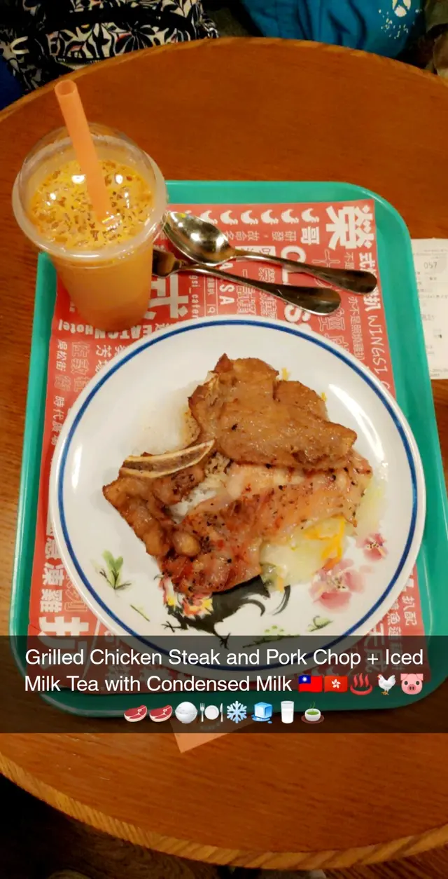 Grilled Chicken Steak and Pork Chop + Iced Milk Tea with Condensed Milk 🇹🇼🇭🇰♨️🐔🐷🥩🥩🍚🍽️❄️🧊🥛🍵