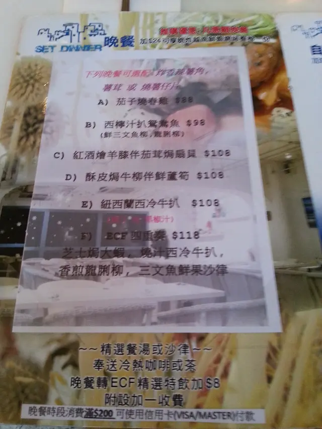 7月最後一日相約了我的好朋友A小姐共晉晚餐,這間ECF CAFÉ 是我一直很想嘗試的,可惜一直都沒有機會,今次只有A小姐與我,晚飯地點又由我發板,首選就是這間位於尖沙咀亞士厘道的樓上CAFÉ,但其實是一間西餐廳呢,這裡可沒有BOARD GAME玩的呀! 由於早一天已BOOK了枱,可以坐窗口位,不過只是望對面的樓宇,沒甚景色的!這也不要緊,我只想找一間餐廳,沒有時限限制,可以友人暢所欲言呢! 我們比預約時間早了15MINS,18:45己到達餐廳了,成為餐廳第一枱客人~餐廳空間感十足,以白色牆身配上油畫以及擺設等,令人有一種舒服悠閒的感覺!雖然我倆只是坐2人枱,但所坐的滕椅相當濶大,放上手袋仍然坐得舒服~ 晚餐有6款選擇,價錢由$88-$118,均包括餐湯/沙律、冷熱飲品. 我們選擇了:-西檸汁扒鴛鴦魚(三文魚柳&龍脷柳)配薯角($98)、-紐西蘭西冷牛扒配薯仔片($118) 先送上是日沙律:-火腿沙律沙律份量頗多,有生菜、青瓜、車厘茄及火腿絲等,沙律醋配上蔬菜酸酸甜甜,幾開胃的,不過生菜不算新鮮,某些葉片黑了一點點的,也就不要吃啦>< -蒜蓉包附送的蒜蓉包熱辣香脆,不過略嫌烘得太乾,有點像吃餅乾!-西檸汁扒鴛鴦魚鴛鴦魚賣相吸引,魚扒煎得剛好,內裡魚肉仍嫩滑,配上酸甜的西檸汁令人食欲大增,伴碟的薯角份量也多,而且也是即炸的,熱辣美味~-紐西蘭西冷牛扒配薯仔片西冷牛扒只是薄薄的一塊,配上燒汁的牛扒牛肉味不濃,我只吃到燒汁以及牛扒的焦香味,伴碟的薯仔片也不吸引,只是切片的薯仔而且有點生生地,頗硬的,還是薯角較為吸引! 餐飲:-凍檸水每次喝凍檸茶OR水也會走甜的,晚上就不會喝檸茶了,怕睡不著,喝檸水也就不怕了; 這裡的凍檸水有3片厚薄適中的檸檬片,也頗大方呢! 飯後喝一杯無糖檸水也有助消滯啊!與A小姐由6時多坐到8時多,店員也不停加水的,也不用客人提點,服務也不錯,而且星期三的晚上餐廳只是坐了一半客人,我們可以慢慢閒聊,真是太好了。謝謝您替我分析事情,給予我寶貴的意見,我明白您是為我好,想我快樂! 查看更多