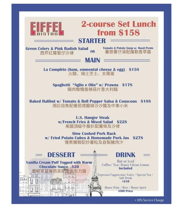 老公想吃法餐,我们也想看电影,所以我们决定去太古城。环顾四周,发现了这家Eiffel Bistro我们点了鸡肉凯萨沙拉和藜麦沙拉作为开胃菜,还点了一份鲽鱼和一些薯条作为主菜。凯萨鸡肉配上长叶生菜、番茄和帕玛森起司。藜麦沙拉配有鲔鱼、松子、葡萄干和石榴。鲽目鱼佐青花菜、马铃薯和柠檬蒜酱。所有的菜都很美味而且做得完美。工作人员非常友善和细心。他们甚至在房子里提供了苹果派,因为那天是我妻子的生日。这是一次美妙的经历,因为我们喜欢这里的食物和服务,我们一定会回来的。人均消费💰 : $ 150总结✍ : 会再黎 , 环境好食物好服务好🏠 Eiffel Bistro地址 : 太古太裕路5号兴安阁地下G514号舖…查看更多