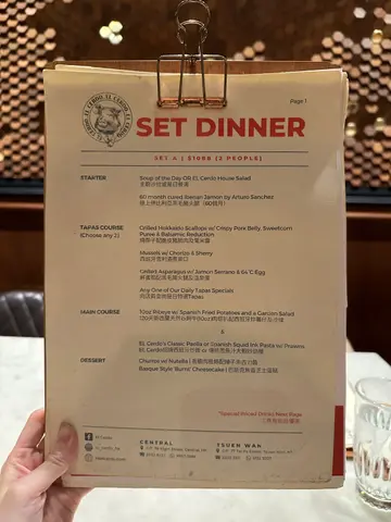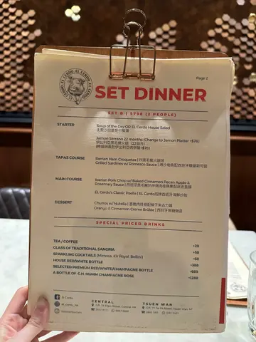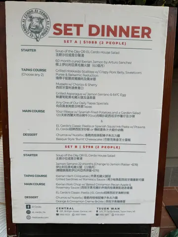 西班牙餐厅 el cerdo 位于荃湾大坝街,如果用 OpenRice 订位,更可享有九折优惠,相当于免除加一。对西班牙菜唔熟悉,攞住餐牌唔多识叫,但侍应态度亲切,仔细解释每道菜式的特色,最后叫咗一个嘅dinner set B二人餐,再加几款嘢食。炸黑毛猪火腿球,西班牙黑毛猪扒伴焗肉桂苹果配迷迭香酱都系好好食嘅,个猪扒肉质鲜嫩多汁。西班牙海鲜炒饭就一般,份量亦都偏少。另外值得一题系我哋加咗78蚊将本来嘅伊比利亚黑毛猪火腿(22个月)转成杂锦风干伊比利亚肉供盘,份量都唔少。三个人食咗1130蚊,平均每人唔使300,咁嘅价钱和咁嘅食物质素,今时今日香港食过晚饭性价比系算高嘅。…查看更多