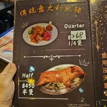 之前听说这家餐厅的意大利乳猪很好吃,午市光顾就最化算,因为意式乳猪饭午餐连汤和热饮只售$110。这天二人同行,除了乳猪饭,还点了另一份午餐,就是红酒烩牛肋条饭( $85 )还加了一份沙律( $12 )。餐牌上写的是甘笋汤,不过侍应告诉我们转成了蕃茄汤。这蕃茄汤蕃茄味香浓,很好喝,而且蕃茄汤比甘笋汤更合我的口味。若想吃沙律,可选生的或熟的,只需加$12 ,还有水牛芝士蕃茄沙律可供选择,不过就要加$45。我们加点了生的沙律菜,份量很大,味道也不错, $12算是超值。意大利乳猪饭送上,碟上的是一只乳猪脾,皮脆肉嫩味道好,就算不沾附上的酱汁,已经很好吃,还有大量的蔬菜,简直超值!至于牛肋条,份量也很多,肉质柔软味道好,同样有大量蔬菜,真的很适合喜欢吃蔬菜的我。餐饮我们点了热柠檬茶和热柠檬水,没什么特别。总的来说,这店的食物质素高,份量大,价钱合理,值得光顾。特别一提,因为每份午餐都附上大量蔬菜,所以若不是特别喜欢吃蔬菜,可以不另加沙律,若爱吃蔬菜,沙律应该选生的,若选熟的,就和午餐的配菜相同了。想一题的是,虽然店内只有一位女士在忙,点餐、上菜、收拾碗碟和结帐等,全是她负责,不过她的工作效率很高,也很有礼貌,而且服务态度很好,例如我们为我们送上第一道菜时,就主动问我们要不要小碟子分吃食物,值得称赞!