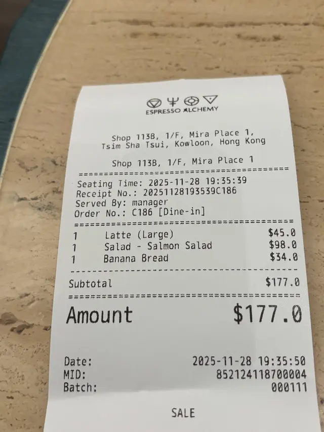 Espresso Alchemy (美麗華廣場1期) (尖沙咀) 网址: https://s.openrice.com/QrLS02rWF00 地址: 香港尖沙咀彌敦道132號美麗華廣場1期1樓113B號舖 电话: +852 26741838