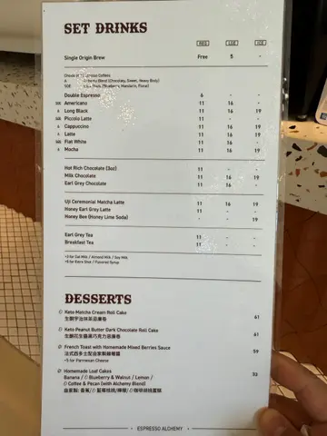 是日要去荃湾买野,想顺便系附近揾个地方叹下咖啡relax 下,上网揾到呢间位于如心广场嘅Espresso Alchemy。餐厅面积唔大,不过最吸引我之处就系有一大块落地玻璃,可以望到出面嘅风景,假日时一边享受咖啡,一边望下出面嘅风景,真系非常写意。餐牌上选择都好多,沙律、意粉、三文治、饮品、甜品咩都有,适合唔同口味嘅人仕。厚切意大利烟肉配卡邦尼意粉:烟肉嘅油香绝对系卡邦尼意粉重要部分之一,呢度嘅烟肉系厚切条状,煎过后带咸香味,劲有口感,酱汁方面亦非常creamy,口感绵密,带香浓嘅蛋香味,配合埋al dente 嘅意粉,非常挂汁,令人一啖一啖咁食过不停。柠檬汁烤鸡烟肉意大利三文治:Panini 系意大利面包嘅一种,烘过后外脆内软,带点烟韧,中间夹住烟肉以及加入柠檬汁烹调过嘅烤鸡,烟韧嘅面包配上嫩滑嘅鸡肉,食落味道同口感都非常夹。法式西多士配自家制杂莓酱:西多士煎至金黄色,口感外脆内软,唔会太甜,伴碟仲有自家制杂莓酱,每啖西多士都沾一下杂莓酱,味蕾嘅冲击带来意想不到嘅满足感。Cappuccino:热咖啡有两个size,两杯细嘅又饮唔晒,所以叫做一杯大嘅share。Cappuccino 拉花好靓,味道偏nutty,口感creamy,一边享受brunch一边叹咖啡,真系非常写意。…查看更多