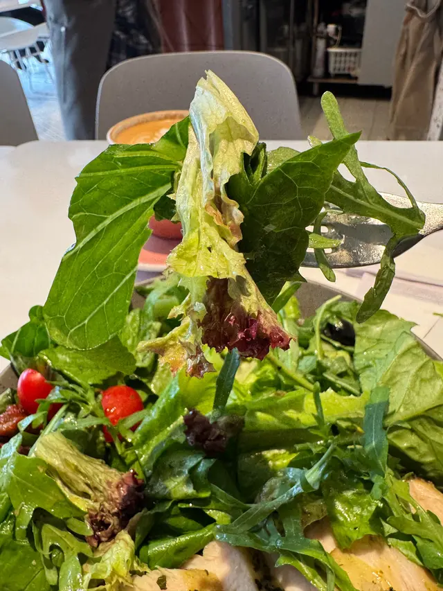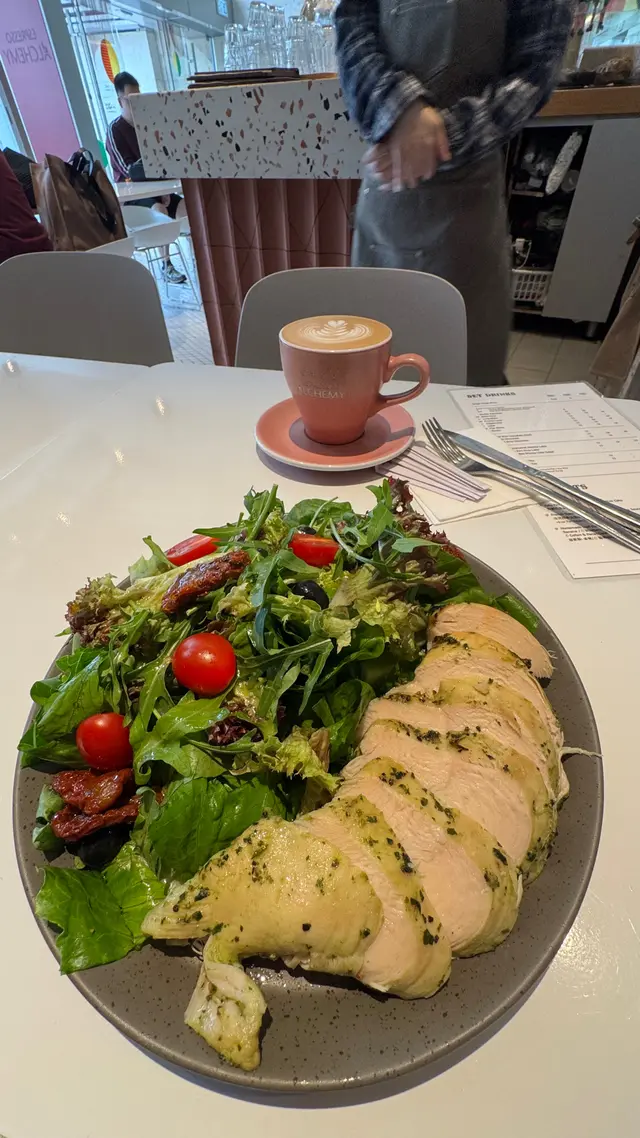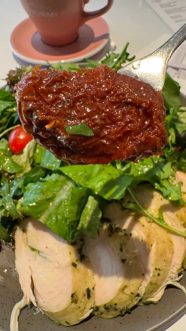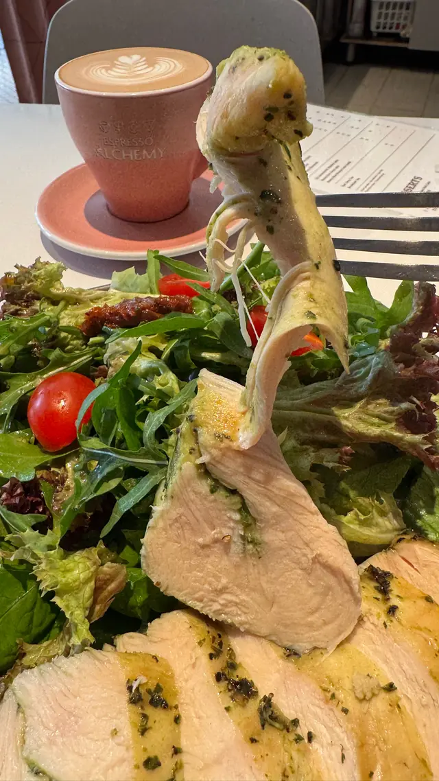 煙三文魚牛油果碎蛋蕃茄三文治。青醬雞胸沙律配檸檬醋醬。