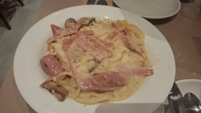 今晚一个人突然想食西餐,好耐都冇食过意粉,于是去咗 euro go go 食,唔知食物质素系点呢?今晚点咗 芝士白汁海鲜意粉,加咗 $8 转宽条面试吓,再点咗杯热嘅蜜桃茶芝士白汁海鲜宽条面,一嚟就见到整碟宽条面面都铺满白汁及浓浓嘅芝士,香气扑鼻,看到已经流晒口水,食落白汁香滑,芝士味又浓郁,而海鲜分别有鱼,蚬同鱿鱼,将芝士白汁混合海鲜同宽条面拌匀一齐食,大大啖,大饱口福!至于杯热嘅蜜桃茶,真系有惊喜,我原来念住应该冇咩味道,点知闻落有清香嘅蜜桃味,里面仲有几片蜜桃,饮落微甜,超合我心意!…查看更多