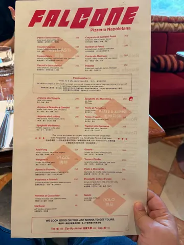 After going to Water Parade, we returned to IFC to have lunch, and decided to try out Falcone, a Napolean pizza restaurant. The yellow signage of red characters certainly is eye-catching. They also have another outlet at The Peak.Seated at the comfortable sofa in the dining area, the décor here is neat, with a fun and casual vibe, using some bright colours in the furniture. Even the staff uniform has a cute design reminding me of ice-cream parlour.After a refreshing BioPlose Pink Grapefruit ($68), the staff served us Insalata Mista ($208). The salad had plenty of lettuce dressed in a anchovy vinaigrette with nice combination of savoury and acidity. Together with caper breadcrumbs and grated pecorino, it was simple but good in taste.Next came Diavola Pizza ($268). A standard 12-inch size, the pizza had a crisp crust on the edge, a thin dough with tomato paste. The toppings included fior di latte, a fresh Italian cheese of mild taste, salame piccante, a spicy cured Italian salami, and some black olives. The pizza was delicious.The Linguine al Granchio e Gamberi ($308) was honestly a bit too much after the pizza. The pasta was al dente in texture though, cooked with prawns, crab and tomato, plus a thick sauce with chilli and vino branco. The pasta was nicely seasoned and flavourful.Service was good, though I was surprised and a bit upset when I saw another table served with mussels when I was told it was not available during my order. Since we were already midway through, I did not ask them to explain. The bill on the day was $1,024. Nice pizza.…查看更多
