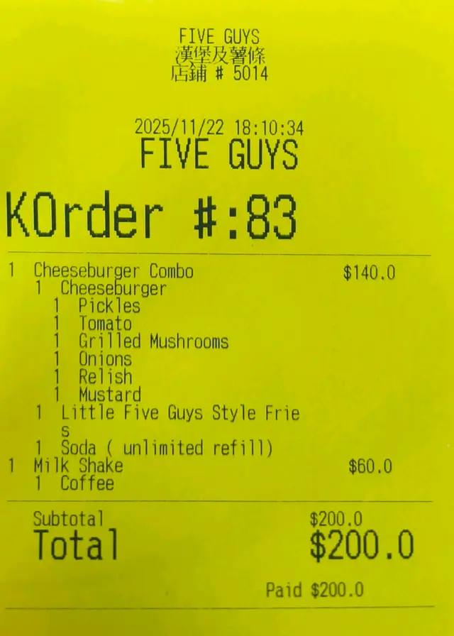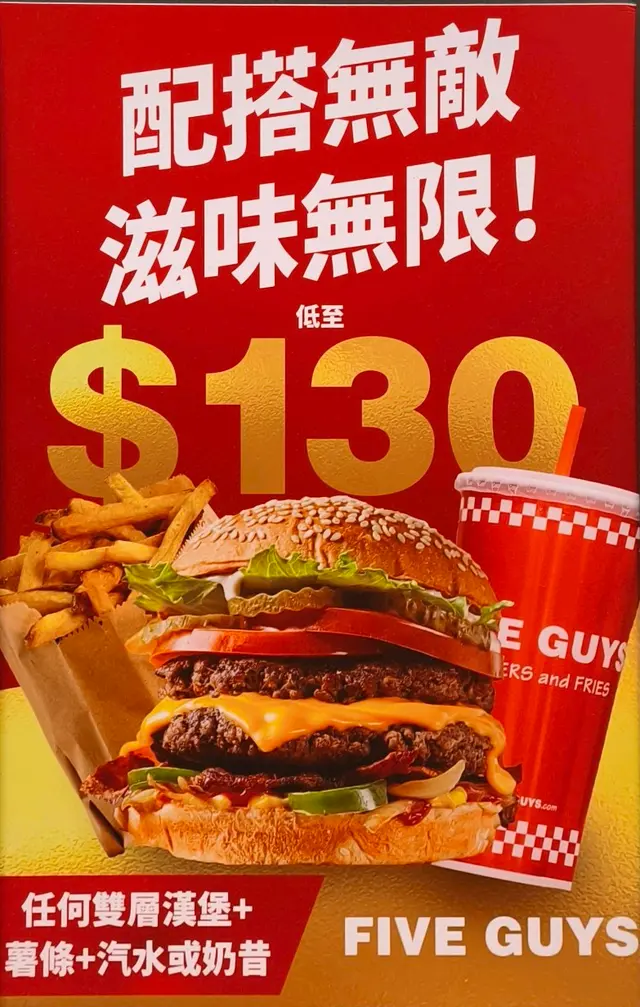 FIVE GUYS (中环) 网址: https://s.openrice.com/QrLS0ezS4W0 地址: 香港中环皇后大道中38-48号万年大厦地库 电话: +852 36189122