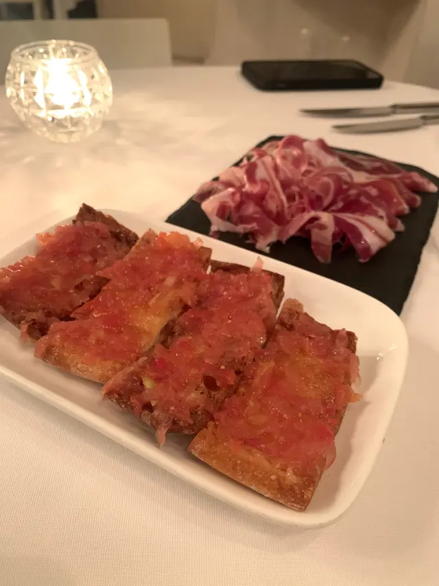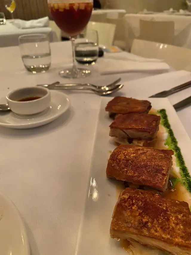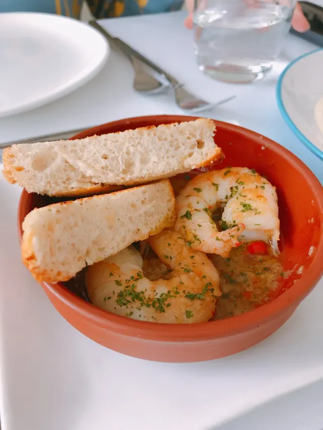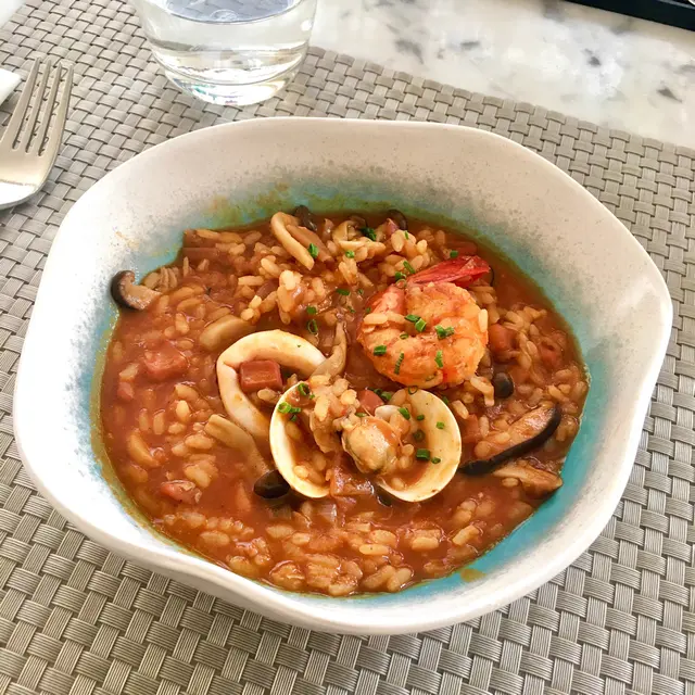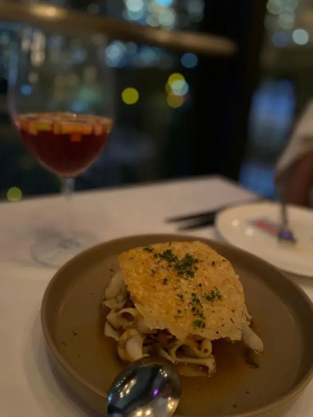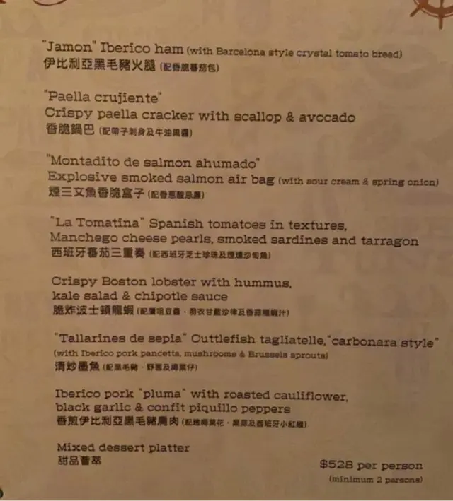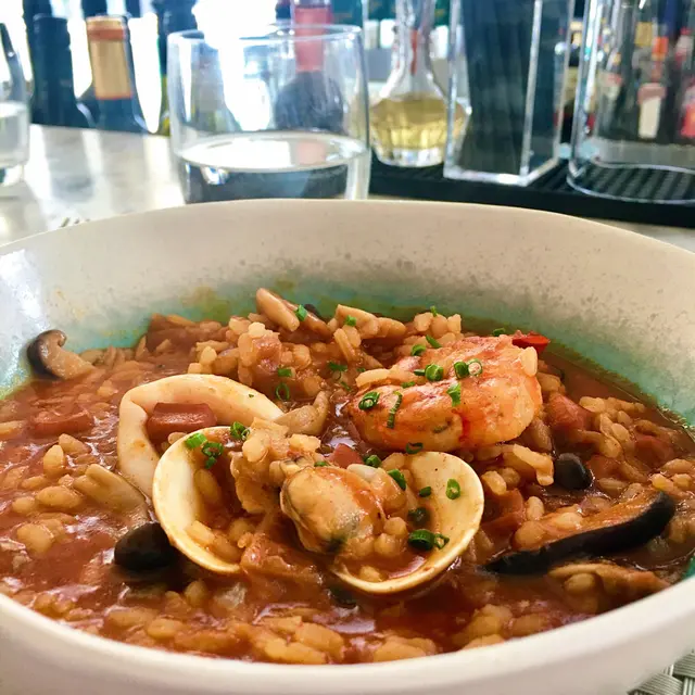 生蠔:新鮮有海水味,蠔身爽脆。配上自家製cocktail 裏面有紅椒、蕃茄、小紅蔥等材料更能夠引起海鮮嘅鮮味。對板。蕃茄橄欖油脆餅:欖油同埋蕃茄嘅美妙配合。鋪上脆口嘅麵包作為餐前小食非常開胃。火腿包馬介休球:火腿嘅濃香襯托炸馬介休球。入邊嘅材料均衡啲大嘅衝擊充滿口中久而不散。小食友報告太大浸芝士味。墨魚汁小馬介休球:墨魚汁嘅鮮味充斥喺個餡裏面令到整個馬介休球都充滿鹹鮮香,回味不斷。更勝火腿馬介休。白酒:清新嘅檸檬柚子同埋百花香味。好似夏天中一陣陣地中海嘅微風吹拂。海鮮沙律配克力架:八爪魚加上帶子刺身配以蕃茄碎橄油沙律。上面再有脆米餅。脆米餅有點像和風既香脆又可口。辣椒蒜頭蝦:蒜頭辣椒煮起嘅橄欖油配以大隻嘅海蝦蝦嘅質素相當之好。肉質既有鮮味亦都有彈性。相當對板。火腿:肉質鬆化,鹹香十足。食到停唔到口。蟶子:配以本菇同埋風乾火腿。雖然加咗啲BB椰菜仔,好有東方色彩嘅一碟餸。不過個人覺得廣東人豉椒炒蟶子先至係王道。燒乳豬:豬肉嫩滑鬆軟,豬皮香脆可口。整個感覺配合得非常之好啊。但係番茄薯仔餅不似預期。比較煙韌同埋過咗火喉。海鮮燴飯:非常之香濃嘅鮮蝦海鮮湯令到整個飯都非常之鮮香。飯嘅生熟度剛剛好。入邊亦都會有好多墨魚粒,亦令到整體嘅口感提升左。上面嘅海鮮裏面龍蝦係比較鮮味而突出。不過青口同埋顯就真係好一般啦。環境:環境舒適,燈光亦非常之恰到好處。配合窗外中環嘅商業區風景以及遠處半山嘅風景,整個感覺十分舒適。不過碰巧當晚有不少多外國人喺度Happy Hour,嘈咗少少啦。…查看更多
