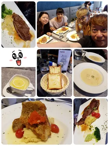 这日和友人庆生,在元朗逛著,在没有预订餐厅的情况下,发现了这间餐厅,从窗外看进餐厅装潢十分华丽,很适合庆祝生日和活动。我犹爱餐厅中央的大水晶吊灯,入夜后灯光效果十分迷人,映照在食物上更显菜肴高贵。前菜是南瓜汤,浓浓的南瓜蓉入口即溶,很是开胃。三文鱼沙津味道清新,肉质鲜美,令人十分惊喜。大虾薯蓉调味独特,虾肉十分鲜甜,配上酸酸的酱汁令人更加开胃。主菜是一道带子蘑菇扁意粉,蘑菇炒得恰到好处,十分爽口,配上白汁和炒到金黄色的带子,令人食指大动,不消一会便消灭了这道菜呢!餐饮点了黑牛牛,原来是可乐配上红豆和奶油,想不到这几样东西味道十分匹配,不会太甜之余满足了我贪新鲜,喜欢多重口感的偏好