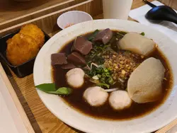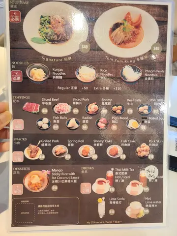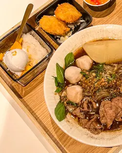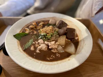 This new thai cuisine restaurant located right opposite to Southorn Basketball Court, focused on serving noodle in the 车仔面 way, so you can pick your own soup base, toppings and pair them with snacks, drinks, or even dessert. ---🍜 The boat noodle soup was absolutely stunning with its authentic richness that I couldn't help finished the whole bowl of soup. Also, it's nice to see they offering Konjac noodle as well, but I picked I prefer to have a more traditional experience with the flavorful Phnom Penh noodle. Highly recommended to have their sliced beef🥩! All the toppings were great with the noodle, but the beef was outstandingly tasty. Also, remember to end your meal with a mango sticky rice as a complete pleasant treat. 😉---▪️𝑺𝒊𝒈𝒏𝒂𝒕𝒖𝒓𝒆 𝑩𝒐𝒂𝒕 𝑵𝒐𝒐𝒅𝒍𝒆 招牌船面$40+ 𝑺𝒍𝒊𝒄𝒆𝒅 𝑩𝒆𝒆𝒇 牛板腱 $18 👍🏽+ 𝑹𝒂𝒅𝒊𝒔𝒉 萝卜 $6 👍🏽+ 𝑷𝒐𝒓𝒌 𝑩𝒂𝒍𝒍𝒔 猪肉丸 $12 👍🏽▪️ 𝑭𝒓𝒊𝒆𝒅 𝑺𝒉𝒓𝒊𝒎𝒑 𝑪𝒂𝒌𝒆 炸虾饼 $18▪️Mango Stick Rice with Ice Coconut Sauce 冰椰汁芒果糯米饭 $15 👍🏽▪️Thai Milk Tea 泰式奶茶 $15---Taste: 👍🏽👍🏽👍🏽👍🏽👍🏽/ 5Service: 👍🏽👍🏽👍🏽👍🏽/5Re-visit ? ✔️ …查看更多