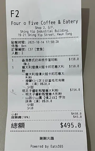Four O Five Coffee & Eatery观塘成业街19-21号成业工业大厦地下2号舖经开观塘,老友推介 Fusion 西餐,环境舒适,食材新鲜,果然冇介绍错。😋蟹肉忌廉汤香浓的忌廉,咸度适中,Creamy 开胃。😺田园沙律沙律菜款式多,新鲜爽口,配黑醋酱汁好惹味。😉烟三文鱼墨汁意大利粉烟三文鱼口感松软,墨鱼汁调配得恰到好处,意大利粉爽口烟韧,飞鱼子提升层次,好味道!😍香煎盲曹伴蒜香薯蓉配刁草柠檬忌廉汁即叫即煎的盲曹鱼,外层香脆,香气四溢,鱼肉松软,一啖鱼肉,一啖薯蓉,Perfect match。酱汁惹味,沙律菜新鲜,摆盘靓,推荐!😻粒粒芒果椰子忌廉梳乎厘师傅即叫即制,松软的梳乎厘,香气慢慢渗出。薄荷叶、开心果和糖霜提升层次,香甜的果肉,香滑的椰子忌廉,大满足!💖✨芒果菠萝沙冰香甜嫩滑,沙冰够冻,甜度适中,好饮!😘冷泡桂花乌龙茶桂花清香,茶味香浓,消暑解渴。😚Four O Five Coffee & Eatery 环境舒适气氛好,食材新鲜高质,必食梳乎厘,侍应服务态度好,回头率高。😎🤘🏻…查看更多