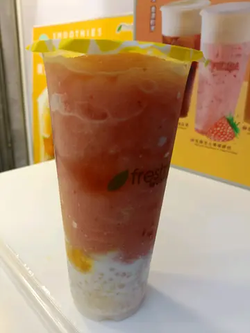 落雨天就系行街嘅日子,呢间位于葵涌广场2楼嘅fresh tea都饮过好多次,今次又出左新品种啦!睇落去几吸引,今日就同朋友各叫一杯,一杯系芒芒甘露,一杯系鸳鸯甘露,两杯都系沙冰质感,芒芒甘露系芒果沙冰加西米底加淡奶,又饮到芒果肉,西米爽口,口感都几丰富,另一杯鸳鸯甘露就系草莓加芒果,底就系西米露,一样加左奶,一口落去,草莓芒果西米就似会响口腔里跳舞甘,特别。酸酸甜甜都几开胃,有时仲饮到草莓嘅一粒粒籽。