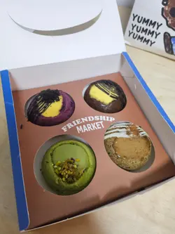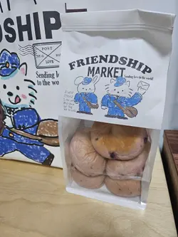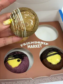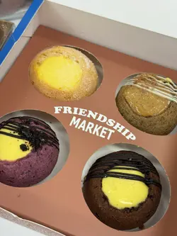 上个月去朋友屋企食过呢一间嘅糯米糍之后,就觉得oh my god好好食呀🤯佢个糯米皮好烟烟韧韧😍!八月初去湾仔做嘢又见到呢一间分店嘅另一个品牌FreshFresh,小妹开心share再将糯米糍推介俾同事🤣大家都赞不绝口!早几日出差去到金钟,见原来金钟都有分店啊,趁住夜晚会返娘家就决定挑选一啲,同家人分享❣️金钟呢间分店原来系湾仔fresh fresh旗下嘅新品牌,唔怪得知熟口熟面啦,佢同母店一样主打色彩缤纷,而金钟分店就好似有乡村面包舖嘅风格,仲有只店长公仔劲可爱😍一向好幸运嘅小妹,喺收工嘅时候去咁啱撞正买三送一优惠😎唔小心就买咗两大袋🤣🤣面包又买啲、bagel又买啲、蛋糕蛋挞都买啲,咁当然唔少得糯米糍啦😁。💛小妹最爱超软熟芒果糯米糍咬落唔系平时食开𠮶种长洲芒果糯米糍,呢度个糯米皮系芒果黄色架,内馅夹著粒粒新芒果肉同唔知系吉士酱定系芒果Yogurt呢🤔咬落真系软熟劲好食😋其次推介bagels(贝果) 们,Frenship嘅Bagels 卖相非常吸引,呢度可以做到一睇个样就知佢系咩味😆例如南瓜乳酪贝果系黄色、芋泥麻糬贝果系紫色、开心果麻糬贝果系绿色、蓝莓忌廉芝士贝果系粉红色带紫色⋯等等!小妹当日去仲见到有位男士一次过买八只贝果🥯,咁啱撞正有优惠真系超抵及好受欢迎👏🏻👏🏻👏🏻👏🏻👏🏻小妹觉得呢间Friendship Market 好适合做香港手信,烘焙产品款式多样化,平时拣手信拣到头痛嘅时候,可以嚟呢度买几盒每日新鲜手制的曲奇饼🍪或袋装面包,而且咁啱佢又喺金钟站,买完就可以搭东铁线,非常方便!…查看更多
