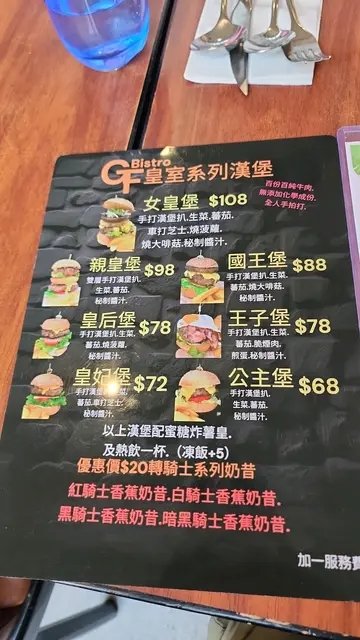 集西餐与音乐于一身,晚上更有歌手现场献唱,气氛写意舒适;菜式推介「GF皇室汉堡系列」,以百分百纯牛肉,无添加化学成分,全人手拍打,口感一流!