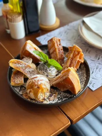 👍🏿紫薯麻糬窝夫配紫薯忌廉及云尼拿雪糕 $88卖相好靓 有两件厚厚嘅窝夫 一pat cream同一球雪糕~窝夫嘅边边位微微脆口 但真系好微同埋要即刻食先得😂中间就唔脆嘅食落好似麻糬咁 烟韧软糯😳如果当佢系麻糬嘅话系唔错几好食嘅🤭但同expect嘅麻糬窝夫就有啲出入🥴佢冇窝夫𠮶种脆 纯粹系好有咬口嘅麻糬~甜度偏低 所以好似食紧冇乜味嘅甜品咁😅紫薯cream够滑 带少少甜味 配搭窝夫系ok ge不过感觉冇乜紫薯味😬雪糕都够滑😙可惜太甜🫣但好好彩佢个窝夫淡淡地 所以连埋雪糕就啱啱好😂错有错着 不过不失咁啦~隔离仲有两旧芦荟啫喱 清甜有嚼口 ok嘅🤣味道: 7/10性价比: 6/10👌🏿梳乎厘班戟配比利时肮脏朱古力 $108嚟到嘅时候比佢卖相吓一吓😳同想像中嘅梳乎厘pancake有啲出入连味道都系🥴两层扁扁地嘅梳乎厘pancake上面淋上大量朱古力酱摆入口同expect嘅一样 完全唔fluffy😭冇空气感𠮶种软熟嘅质感 比较实净~至于蛋香…唔sure有冇 就算有都比朱古力味cover晒不过值得一赞嘅系佢嘅朱古力味好rich带少少dark chocolate嘅香醇😳但加咗Oreo碎 焦糖同糖霜之后 甜度大大提高🥴如果就咁食朱古力pancake嘅部分甜度系啱嘅但捞埋其他嘢就甜咗啲🤏🏿香蕉本身都有甜味 加咗焦糖反而甜到有啲唔太自然😗虽然overall佢唔算伏 细佬👦🏻话ok好食但真系唔系史努比杯茶😌味道: 6/10性价比: 5.5/10*另设加一服务费*去得将军澳海旁食嘢贵就预咗架啦不过味道普通不过不失 史努比觉得唔太值😬性价比唔高啦~试完唔会觉得话好伏 不过冇下次😂整体评分:味道: 6.5/10环境: 8/10服务: 7.3/10卫生: 8.4/10抵食: 5.8/10…查看更多