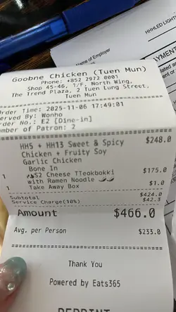 喉咙痛两个星期忍口唔食得煎炸嘢今日终于忍唔住大约下午五点几,望入去得一台,快速食个晚餐之后再返工。其实对上一次食都已经系几年前🤣因为要控制热量问题,唔可以成日食😓叫咗果味双拼甜辣鸡 $248再叫多个芝士拉面年糕 $178个人认为芝士拉面年糕一定要热食,因为冻咗所有嘢都会变硬上面𠮶啲鱼饼份量都好多 多到我唔太想食😅 但呢个价钱都算偏贵烤鸡,感觉上比炸鸡健康啲🤣几年前食同而家一样都系咁好味好多口味,但系第一眼望到甜辣就抗拒唔到甜辣比较果味浓啲 份量多食唔晒要打包
