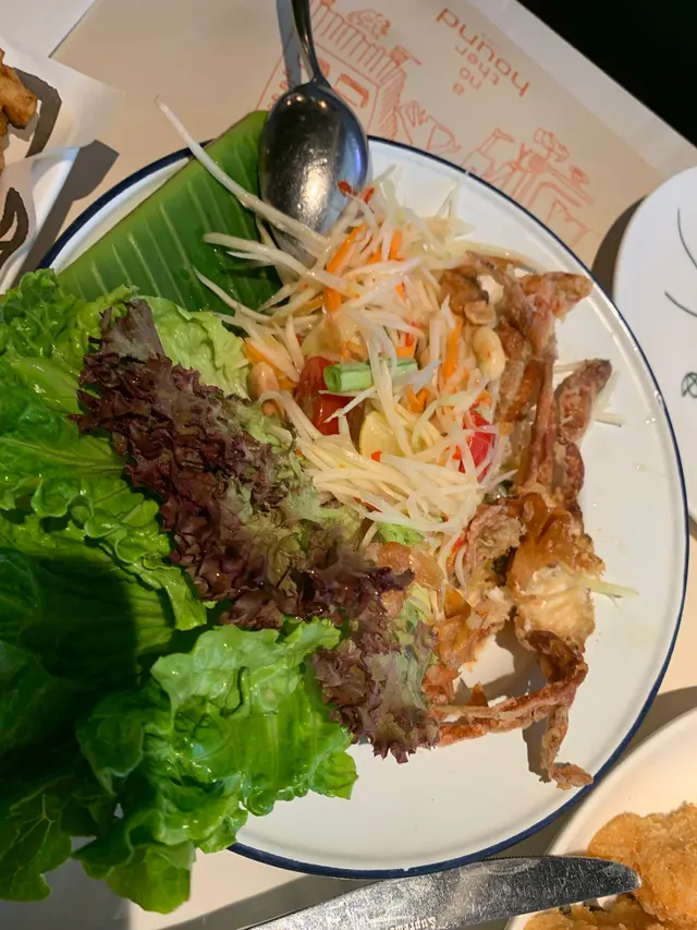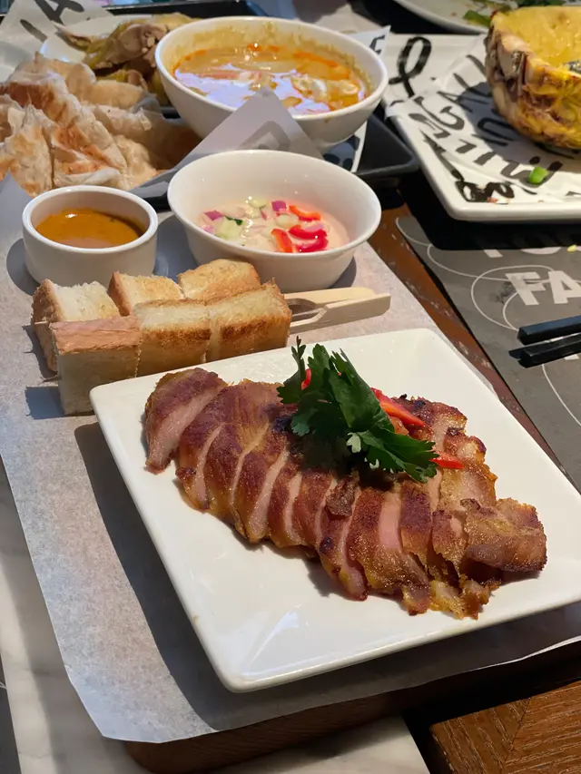 因為想食泰式炸豬手同而家喺曼谷好heat 既蟹肉奄列,所以揀咗呢間泰菜餐廳,點知中伏😪佢唔係正宗做泰菜,又夾埋啲西餐~~飲品都好花巧,傳統簡單嘅泰式飲品種類好少。呢間用錢買打卡位,想要食有水準嘅食物,就建議其他,可能西餐佢會好味啲。先睇張單,價錢中上,當日午市,泰式炸豬手同滷水豬手都話賣晒😨 竟然⋯? 一定唔會啦,我估係冇師傅做,有啲失望😞冇豬手食,好彩都有蟹肉奄列,但係完全2樣野黎嘅,煎炒蛋入面冇蟹肉,只得面頭幾粒,網上求其一間,都唔會係佢呢個做法! 真係超失望☹️! 味道唔洗講啦,普通家庭主婦都做到!粉絲大頭蝦煲~ 太鹹~ 重手咗,亦冇泰式個種味道。😪跟set 加錢嘅雞翼, 係小朋友口味,正正常常,有色有鹹味,但一定冇用香茅,胡椒之類醃,唔係泰式。羊架配咖喱~ 店員有問我哋羊架幾成熟。羊架應該係煎完之後放入去,咖喱都好味嘅,有香料,有小豆蔻,係呢餐最好味嘅1個餸。泰式凍奶茶,正常發揮。(以上全是個人意見)查看更多