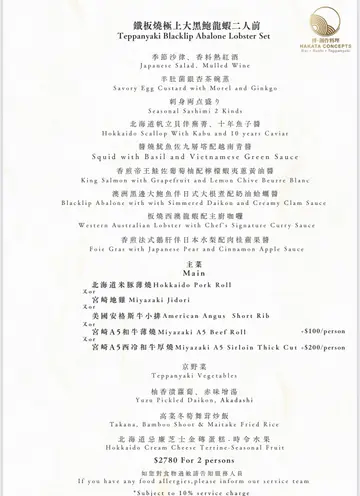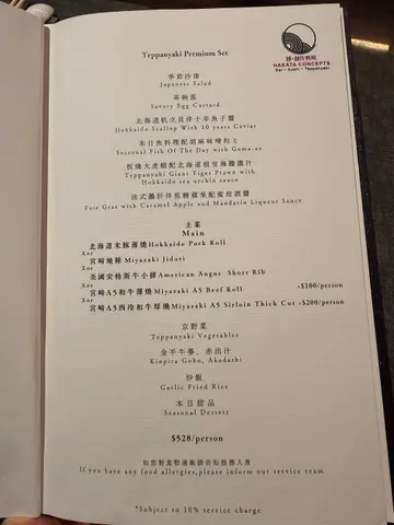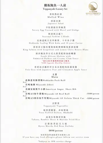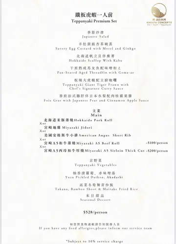 今日黎到屯门黄金海岸「Hakata Concepts」晚餐拣咗Teppanyaki Premium Set⭐️季节沙律新鲜的时令蔬菜及青提搭配清新的酱汁开胃又健康😆⭐️茶碗蒸口感滑顺鸡蛋的香气与鲜味十分突出面头加咗蟹籽 增加层次感🤩⭐️北海道帆立贝伴十年鱼子酱帆立贝鲜嫩多汁鱼子酱的咸香与其完美融合让人印象深刻😄⭐️本日鱼料理配胡麻味噌和马友的鲜味与胡麻味噌的香气结合令这道菜色香味俱全非常好味👍🏻⭐️板烧大虎虾配北海道根室海胆浓汁虎虾的鲜甜肉嫩搭配海胆的浓郁😍令人回味无穷⭐️法式鹅肝伴焦糖苹果配蜜柑酒酱鹅肝香滑焦糖苹果的甜味与蜜柑酒的酸味为整道菜增添了丰富的层次十分出色🫶🏻⭐️主菜宫崎地鸡肉质鲜嫩风味独特😙火候控制得啱啱好⭐️美国安格斯牛小排牛肉质地柔嫩油花分布均匀烧烤的香气扑鼻而来😉⭐️京野菜搭配的京野菜新鲜消除油腻感⭐️金平牛蒡、赤出汁牛蒡的香脆与赤出汁的鲜味非常配搭特别系面豉汤非常浓郁☺️⭐️炒饭炒饭粒粒分明作为餐后的配菜非常满足⭐️甜品 本日甜品系开心果雪糕十分惊喜为整个用餐体验画上完美的句号😊…查看更多