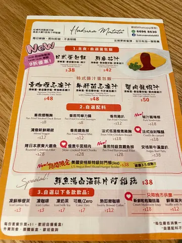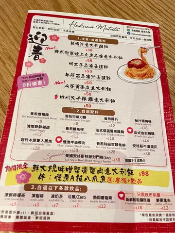 💕 🩷 【 𝑯𝒂𝒌𝒖𝒏𝒂 𝑴𝒂𝒕𝒂𝒕𝒂 】 🩷 💕⋄ —————⧫♟⧫————— ⋄最近喺关注组睇到一间讨论度颇高嘅西餐厅,呢日同朋友喺附近体育馆打完波,就专程过嚟试吓😏一行7人坐低食个lunch,环境走日式木系风格,气氛悠闲🍂🌾 价钱都几抵,全部唔超过$70,仲全日免加一服务费👍🏻食物选择基本上一张Menu睇晒,A-E餐🔖 主食有意粉、不同肉类及健康之选椰菜花饭等,另可配搭白米饭、薯蓉或沙律等🍚🥩🥗 感觉出奇地健康,营养均衡😊我哋每个餐都试匀晒,完全感觉得到食物系用心制作:意粉浓郁美味,肉类软腍又够入味🧡 最惊喜系「海胆芝士米形意大利面」,海胆酱汁劲鲜美;仲有「低温慢煮鸡胸」意外地嫩滑💕加$3就可以拣埋饮品,完全系性价比之选😄可能店家人手唔够,所以用上即弃纸碟,令卖相打了折扣❤️🩹 食物份量亦建议可稍微增加一点(大食嘅男仔可能会唔够饱)🫣但总体来说食物质素唔错,真系值得各位街坊一试🫰🏻⋄ ┄ ┄ ┄ ┄ ❖ ┄ ┄ ┄ ┄ ⋄▪️◾️𝐒𝐄𝐓 𝐋𝐔𝐍𝐂𝐇精选午餐◾️▪️✨香浓番茄奶油玛稣里拉芝士米形意大利面•香烤青衣鱼柳(杂菜沙律) $64✨日式酱油慢煮牛面颊肉•杂菜沙律 $66意粉或白米饭或香滑薯蓉✨法式低温慢煮鸡胸伴车打芝士•黑松露椰菜花饭(低卡蒟蒻面沙律) $65✨法式油封鸭腿•烧汁(香滑薯蓉•杂菜沙律) $65▪️◾️𝐓𝐨𝐝𝐚𝐲’𝐬 𝐒𝐩𝐞𝐜𝐢𝐚𝐥◾️▪️✨海胆芝士米形意大利面•香烤青衣鱼柳(杂菜沙律) $70⋄✨明太子芝士米形意大利面•香烤青衣鱼柳(杂菜沙律) $80+$3自选以下各款饮品:🍋冻鲜柠檬茶 / ☕️冻即磨咖啡⋄ ┄ ┄ ┄ ┄ ❖ ┄ ┄ ┄ ┄ ⋄⋄📍地址:Hakuna Matata (红磡)红磡马头围道35号隆基大厦D座地下48号舖