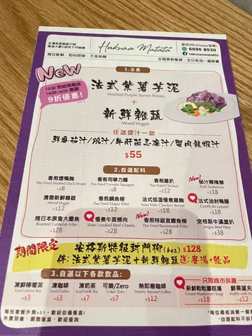 👯♀️同朋友系红磡打完羽毛球🏸经过小巷见到呢间𝐇𝐚𝐤𝐮𝐧𝐚 𝐌𝐚𝐭𝐚𝐭𝐚,店员热情推介下就入左去食𝒍𝒖𝒏𝒄𝒉 🍴午餐好抵食,$𝟲𝟮起加$𝟯仲包埋野饮🍹 𝟐:𝟎𝟎后仲有𝟵折优惠,食物味道非常高质,性价比高,认真抵食😋😋⋄⋄====—====—====—====—✦ 𝑻𝒐𝒅𝒂𝒚’𝒔 𝑺𝒑𝒆𝒄𝒊𝒂𝒍 ✦①💛海胆芝士米形意大利面•香烤青衣鱼柳| 杂菜沙律($70)海胆和芝士融合在米形意大利粉中,浓郁滋味,搭配香煎青衣鱼柳,面层香脆,鱼肉嫩滑,搭配的杂菜沙律清新爽口😋⋄②🧡明太子芝士米形意大利面•香烤青衣鱼柳| 杂菜沙律($80)米形意大利粉非常特别,坊间比较粉地方吃到,比起一般的意大利粉更为挂汁,味道更加浓郁👅明太子和芝士交织出浓郁的香味,好香口🤤⋄✦ 𝑺𝑬𝑻 𝑳𝑼𝑵𝑪𝑯 ✦③🍅香浓番茄奶油玛稣里拉芝士米形意大利面•香烤青衣鱼柳| 杂菜沙律($64)浓郁的番茄忌廉芝士完美融合,吸收在每一粒米形意粉😙浓郁的奶香与酸甜滋味交织,口感层次非常丰富👍🏻⋄④🐄日式酱油慢煮牛面颊肉•杂菜沙律配意粉或白米饭或香滑薯蓉($66)慢煮牛面颊肉经过细心处理及烹煮,散发浓郁的日式酱油香气,肉质柔软香嫩,配上人手制作的薯蓉非常香口,还吃到粒粒薯仔碎🥔 ⋄⑤🐥法式低温慢煮鸡胸伴车打芝士•黑松露椰菜花饭低卡蒟蒻面沙律($65)低温慢煮的鸡胸保留了肉质的鲜嫩多汁的口感,淋上车打芝士酱汁后,口感更浓郁醇厚😋黑松露椰菜花饭口感特别,加上黑松露味道层次升华❤️⋄⑥🍗法式油封鸭腿•烧汁香滑薯蓉•杂菜沙律($65)众多午餐之中,朋友点的法式油封鸭腿最得我欢心,以法式制法的油封鸭腿入口即化,肉质鲜嫩多汁,真系一试难忘,个人推荐配香滑薯蓉,配生浓郁烧汁层次更加丰富,下次黎我要再𝒆𝒏𝒄𝒐𝒓𝒆呢个!!😋😋⋄🥬蒜茸白酒炒杂蔬+$38套餐加$3 🍋冻鲜柠檬茶|☕️冻即磨咖啡====—====—====—====—.📌店名:Hakuna Matata (红磡)’📍地址:红磡马头围道35号隆基大厦D座地下48号舖