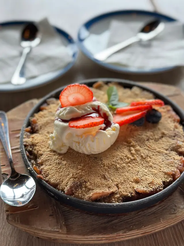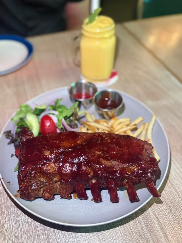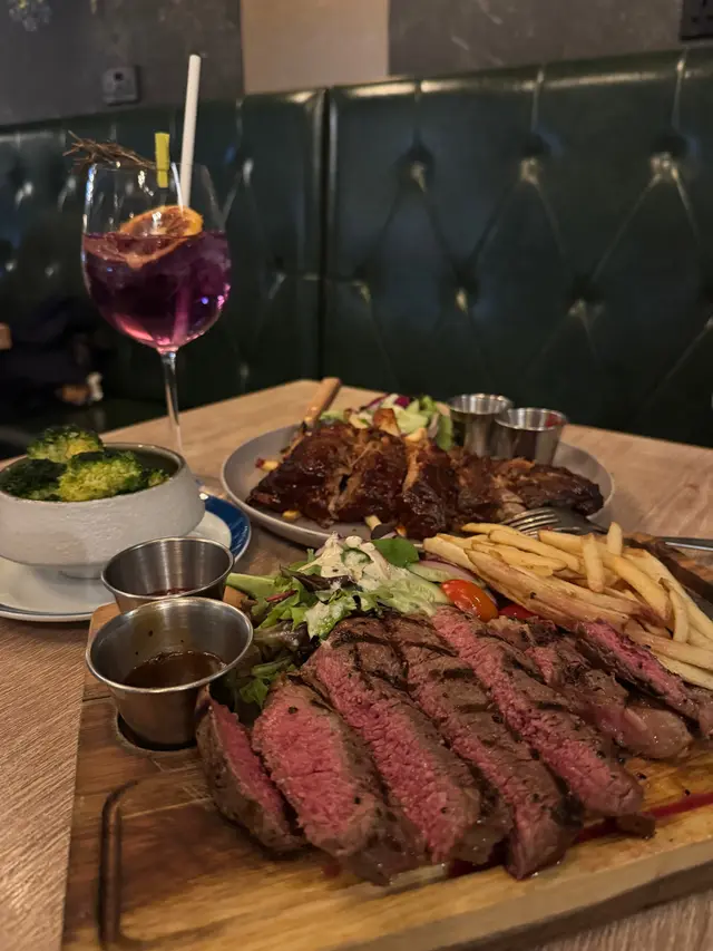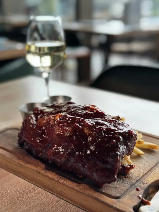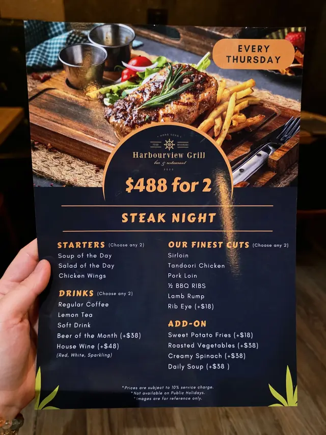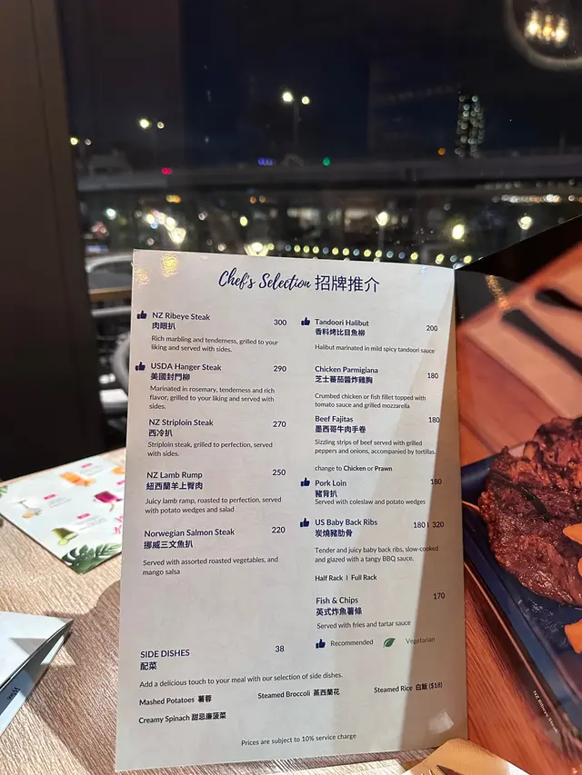 位於北角的西餐廳。 踏入又愛又恨的九月,雖已立秋,卻毫無秋意可言,唯一帶來絲絲涼意的,竟是颱風暴雨的那幾天。在這個天氣變幻無常的季節,唯有海景與日落能帶來一份恬靜與愜意。.最近頻繁進出北角,無意間發現了一間坐擁露天海景的西餐廳。適逢星期四是「Steak Night」,對於愛肉一族來說,一邊品嚐牛扒,一邊欣賞迷人海景,也算是另類的TGIF體驗吧!(雖然只是星期四... ⋆__steak night $488/2ppl ___⋆ ✿ starter: ⧐ 是日餐湯⧐ 秘製香辣雞翼前菜的秘製香辣雞翼外皮香脆,內裡多汁,帶點微妙的煙燻風味。而湯品則是每日更換,這天是濃郁的蘑菇湯,入口順滑,帶有淡淡的蘑菇天然香氣.✿ Main:⧐ 肉眼 +$18⧐ 炭燒豬肋骨肉眼牛扒煎烤得恰到好處,五成熟的肉質嫩滑多汁,表面帶有炭燒的誘人焦香,搭配簡單的黑椒醬汁,完美呈現牛肉的濃郁原味。炭燒豬肋骨同樣出色,醬汁甜中帶酸,肉質軟嫩入口即化,骨邊的肉充滿嚼勁;不過,前段和尾段的肉略嫌稍韌,中段的口感最為完美。兩款主菜均附上大量香脆薯條,香脆可口,令人食不停口。.✿ Add-on:⧐ 甜蕃薯條 +$18⧐ 甜忌廉菠菜 +$38配菜方面,甜蕃薯條是送酒神器。外脆內軟,甜度自然,與附餐的經典薯條形成鮮明對比,帶來雙重享受。甜忌廉菠菜則是另一亮點,濃郁的奶香與綿滑忌廉完美融合,襯托鮮嫩菠菜的清新。.✿ Drinks: Coffee or Tea...✿ 朱古力心太軟配雪糕 $98✿ Cocktail: Get lucky $78除了套餐以外,望住個海就自然想飲酒配甜品,因此也另外加點了一份心太軟及雞尾酒。心太軟絕對是甜品控的福音,一刀切下去,濃郁的朱古力岩漿緩緩流出,搭配一球香草雪糕,甜而不膩。雞尾酒「Get Lucky」則清新宜人,金桔糖漿的甜酸與伏特加的烈性完美融合,檸檬汁更添一抹清爽,與海風相伴,喝起來格外愜意。…查看更多