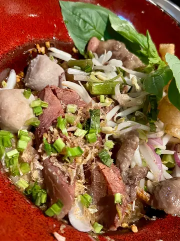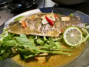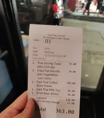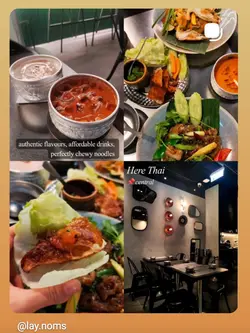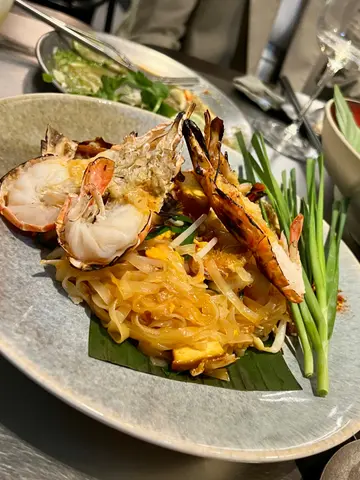 Thai shrimp toast with chilli dip $78- shrimp toast is crispy and wrapped with lettuce, topped with a sweet chilli salsaFried flat noodles with veggies $78- really chewy noodles like the ones you'd get in Thailand- quite oily but it's very fragrant and spicy Pad Thai grilled river prawn $108- prawn is big and meatyThai milk tea $28- sweet and concentratedoverall this place has very reasonable prices and great ambience! …查看更多