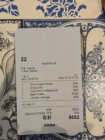 呢间藏身喺土瓜湾嘅 café,平日夜晚都几满座,气氛chill又有啲法式感,啱哂同朋友慢慢倾计💬☕️🍷 红酒慢煮牛面颊肉配薯蓉一上枱就好香!牛面颊肉用红酒慢煮到极腍,用叉轻轻一揿就散开,肉味浓郁又唔干。红酒汁味道浓郁又唔腻~配上牛油香滑嘅薯蓉,啖啖柔滑,真系完美match💯 ❤️🍝 羊肉酱炒猫耳朵意粉猫耳朵烟韧弹牙,挂汁力超强💪 羊肉酱浓厚,加埋 Ricotta cheese creamy 得嚟又有层次~最正系带返少少羊膻香,超满足!🐑❤️ 中意食羊嘅朋友一定要试!🥤 番石榴香橙冰茶 带少少果香酸甜味,饮落清爽解腻,配主菜啱啱好🍊。🥤 桂花黄瓜柠檬水 清新花香味渗出,黄瓜香气淡淡的,味道自然唔造作,饮完有种被refresh嘅感觉🌿✨ 🍰 重头戏一定系甜品! Tiramisu梳乎里班戟 松软香滑,甜度啱啱好!班戟厚厚一层,质地松软绵密,热辣辣上枱仲有微微蛋香~面头有lady finger可以跟据自己喜好加rum油。再加上可可粉苦中带甜,味道平衡得好靓。切开一啖,入口即化,好治愈~每一啖都系幸福感爆灯💕🍍 凤梨可乐达芭菲杯 法式千层酥脆香、烧RUM菠萝香甜带酒香~ 云呢拿雪糕、红茶啫喱同脆脆,层次感满满~ 一杯完美收尾👏整体嚟讲,主菜水准高、甜品更系亮点😋 价钱合理、环境舒服、饮品清新,无论系约会定闺蜜聚会都好啱~💫✨ 呢期仲有午市优惠~❣️ 点 main course 会送热黑咖啡 / Earl Grey Tea❣️ 可加购 是日餐汤 / 甜品 ❣️ Lunch set 印花卡储满六个印花 即隔日可享免费 Lunch Set 一份及附送黑咖啡📍 HeySoNuts 土瓜湾北帝街147号地下3号铺…查看更多