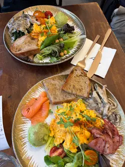 不经不觉在铜锣湾拥有醒目蓝色 sᴛᴏʀᴇғʀᴏɴᴛ 的 ʜᴏɢᴀɴ挨过 ᴄᴏᴠɪᴅ 后仍屹立不倒可想而知是区内很有实力的咖啡小店这次跟友人来个早餐探店十点许小小用餐区域已坐满人正惆怅是不是已经没有位置之时原来在出餐位置后别有洞天里面还有数张二人桌 形成隐世小天地 小房间各种蓝色布置跟画作与外面光亮用餐区有著不同风格的鲜明对比餐点以丰富主食为主提供全日早餐 汉堡 意粉等小小的料理区发挥了无限大的美食空间𓋪 手撕猪肉汉堡𓋪 素食早餐拼盘𓋪 班兰流心法式多士𓎾 ʟᴀᴛᴛᴇ𓎾 ᴍᴀᴛᴄʜᴀ ʟᴀᴛᴛᴇ素食版全日早餐有炒菠菜跟杂菌 我们都很爱没有肉的 ᴀᴅʙ 也减少了油腻带来的罪恶咸香猪肉丝跟炒得焦香的洋葱夹在汉堡里面比起平常吃汉堡质感更结实 口感很喜欢招牌餐点是邪恶的法式吐司ʜᴏɢᴀɴ 会不时更换法式多士的馅酱这次的是班兰 ~ ᴛᴏᴘᴘɪɴɢ 有香甜水果切开中间流出浅绿的班兰酱吐司软绵绵的很好吃 建议班兰味可更重一点虽建在静中带旺的铜锣湾小街但人流仍络绎不绝 看起来大家都很喜欢他们下次再来可以尝尝其他口味的法式吐司…查看更多